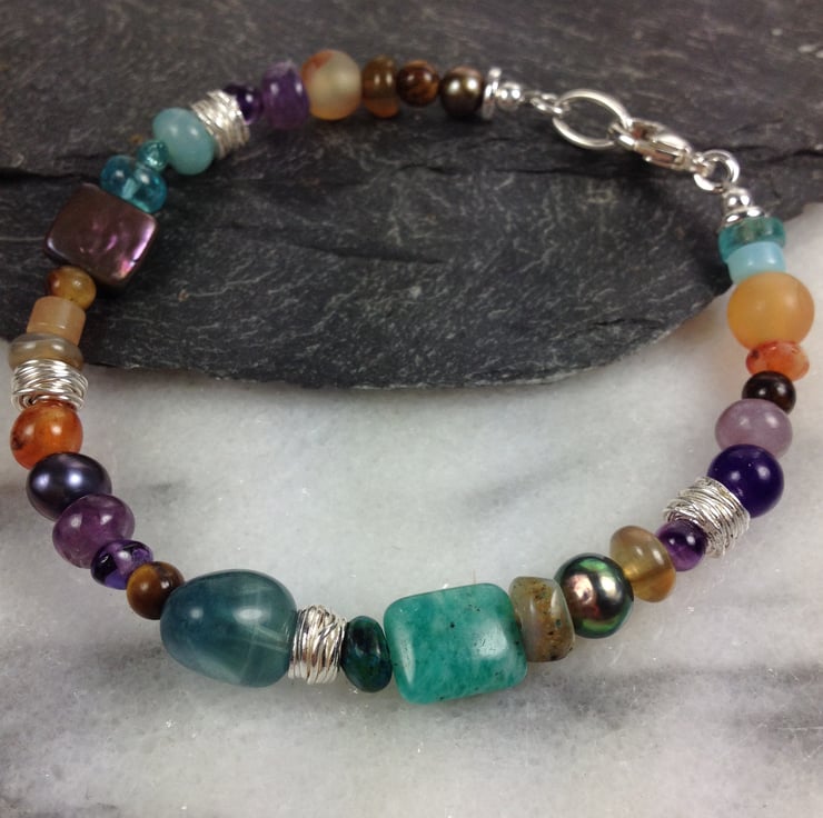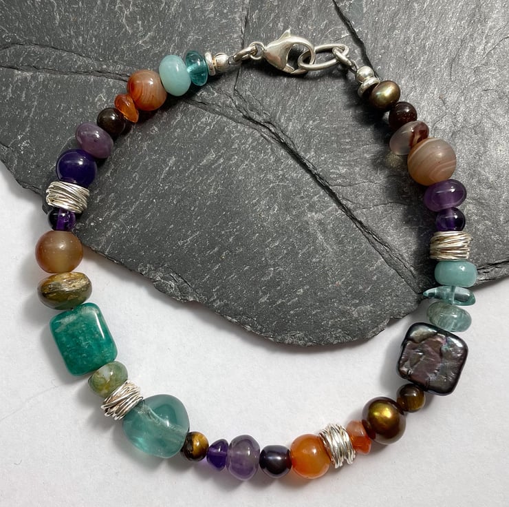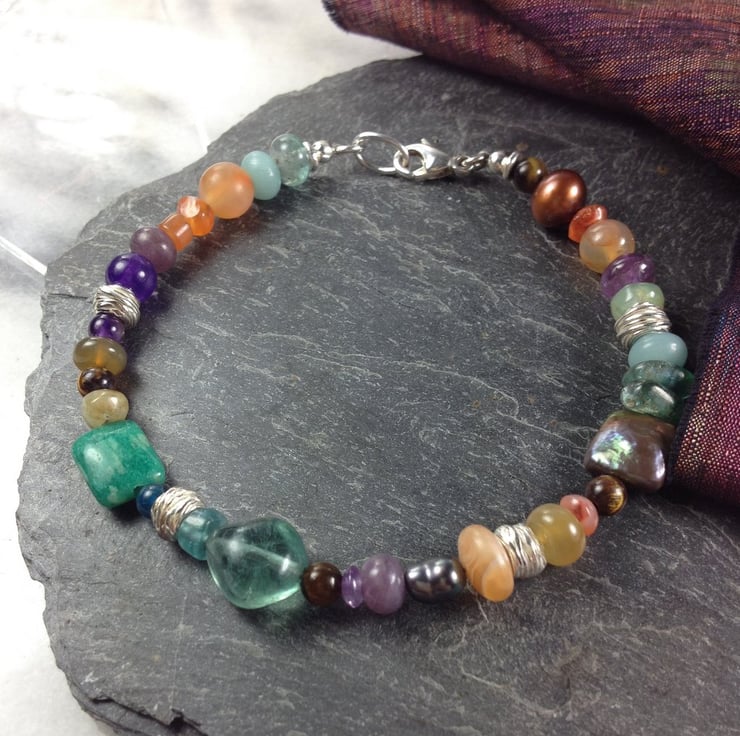 A pretty bracelet in muted tones of bronze, orange, purple and teal highlighted with bright silver .