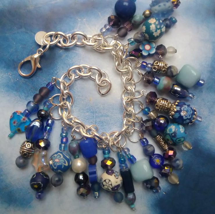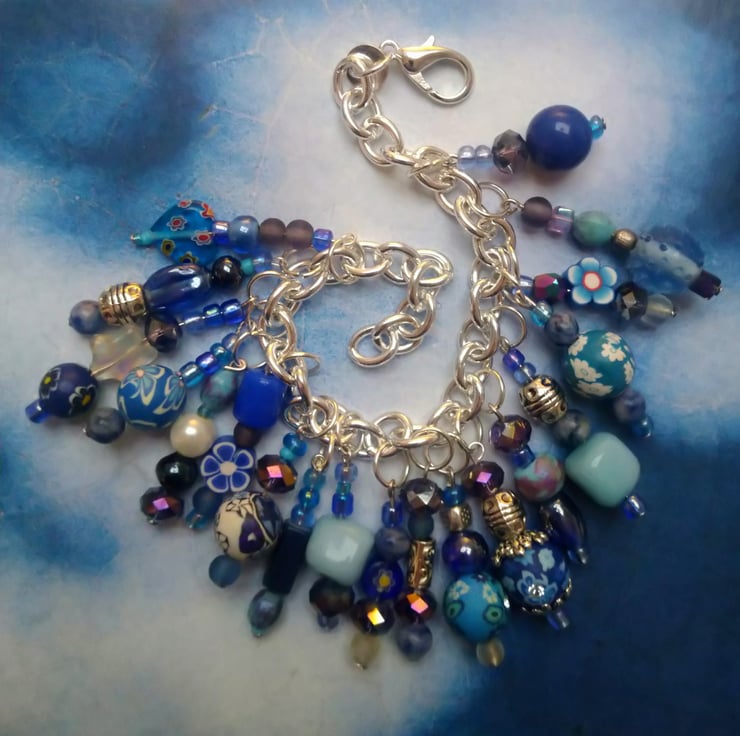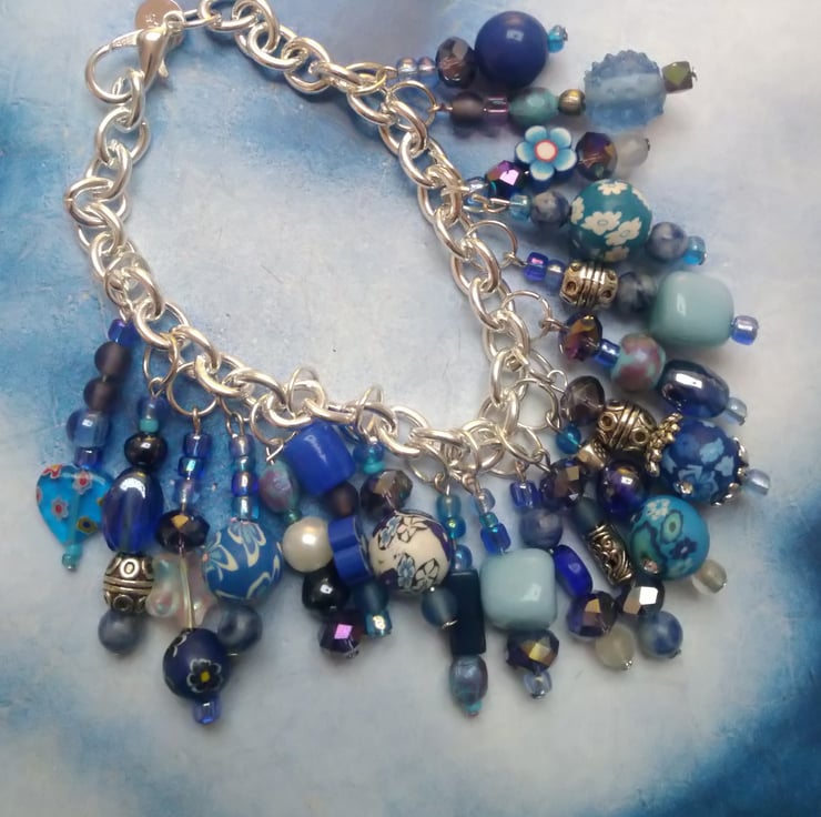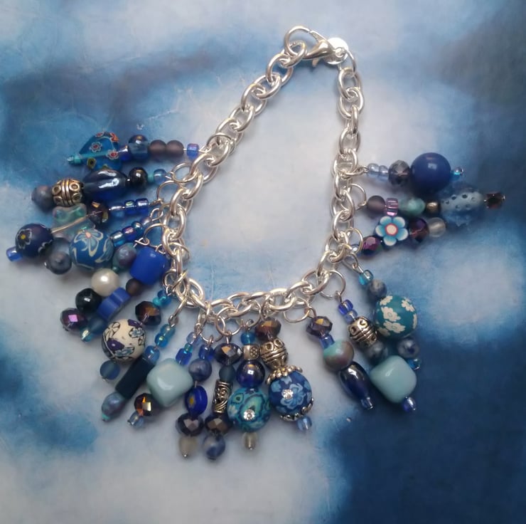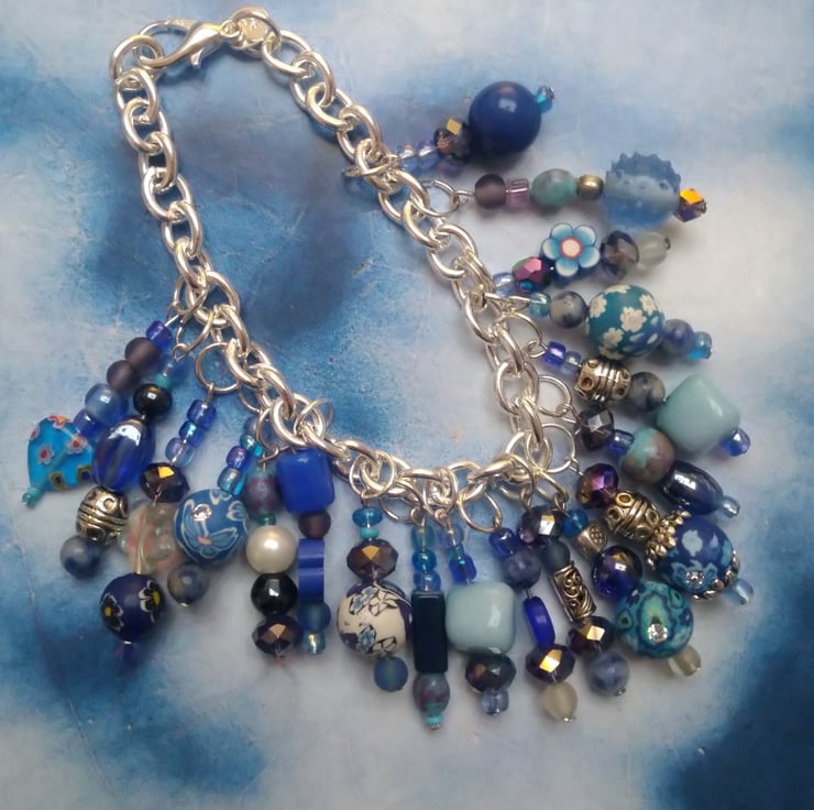A really beautiful bracelet made with a wonderful treasure trove of recycled beads. Lots of individual strands of gorgeous beads in ceramic, Tibetan silver, acrylic, faceted glass, frosted glass, tiny glass, millefiori glass. Hanging on a 925 sterling silver chain with a lobster catch. Unique and a beautiful piece of jewellery.