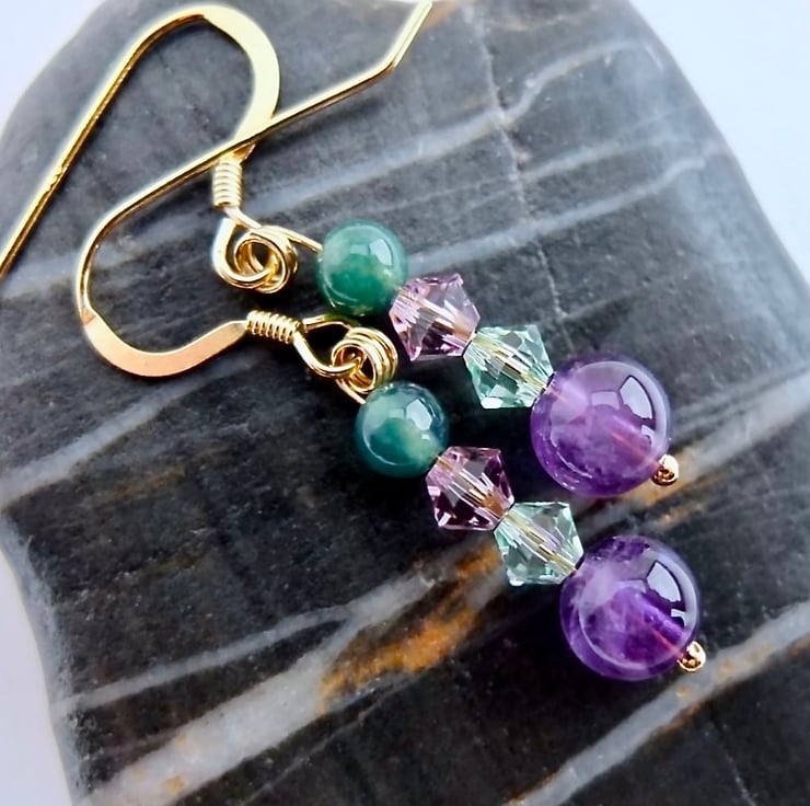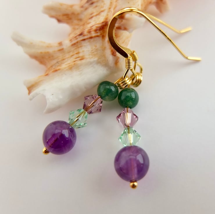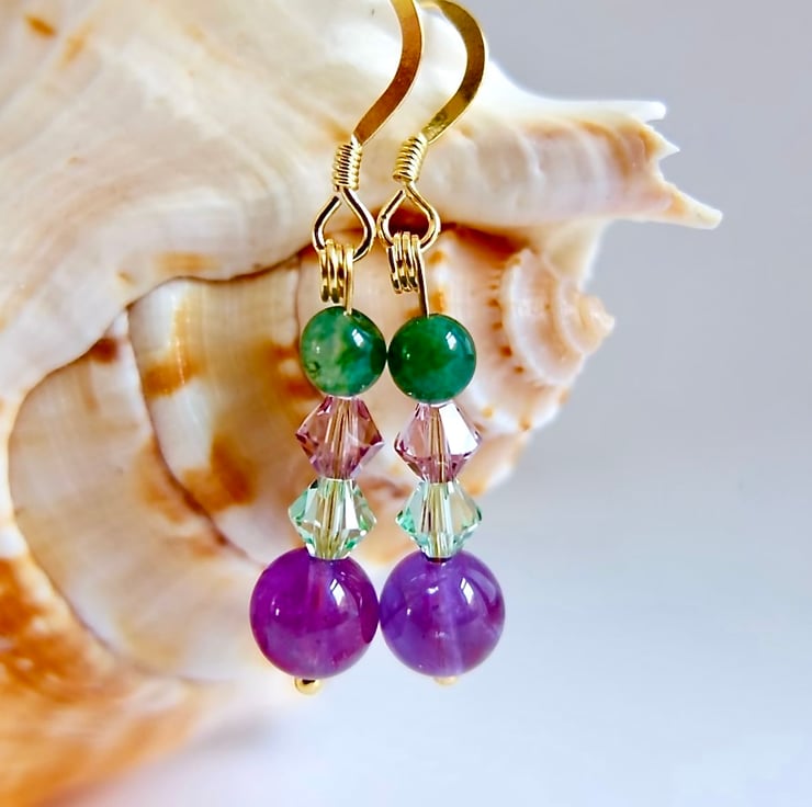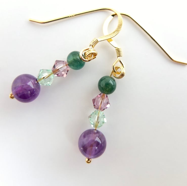 A 6mm Amethyst bead, quality Austrian crystals in the colours "chrysolite" and "light amethyst" and a 4mm moss agate bead make up these sparkly earrings.