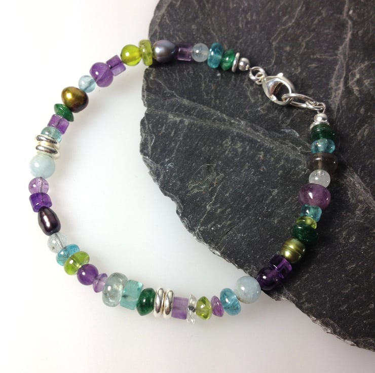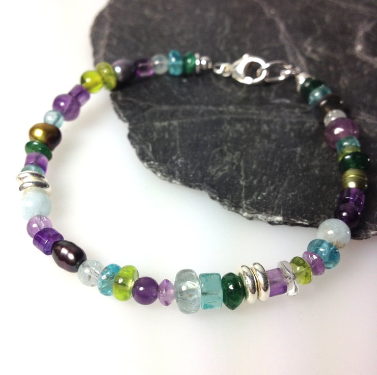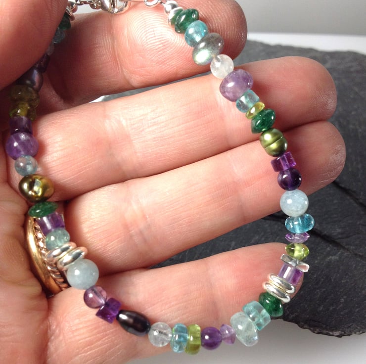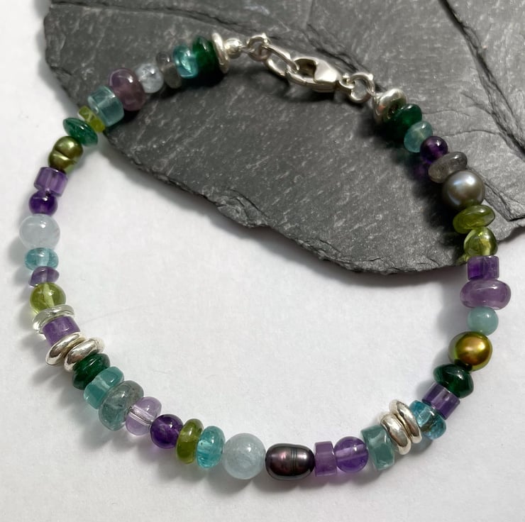 I have combined peridot, aquamarine,amethyst, apatite, aventurine, labradorite and green and peacock freshwater pearls with polished sterling silver beads and clasp.