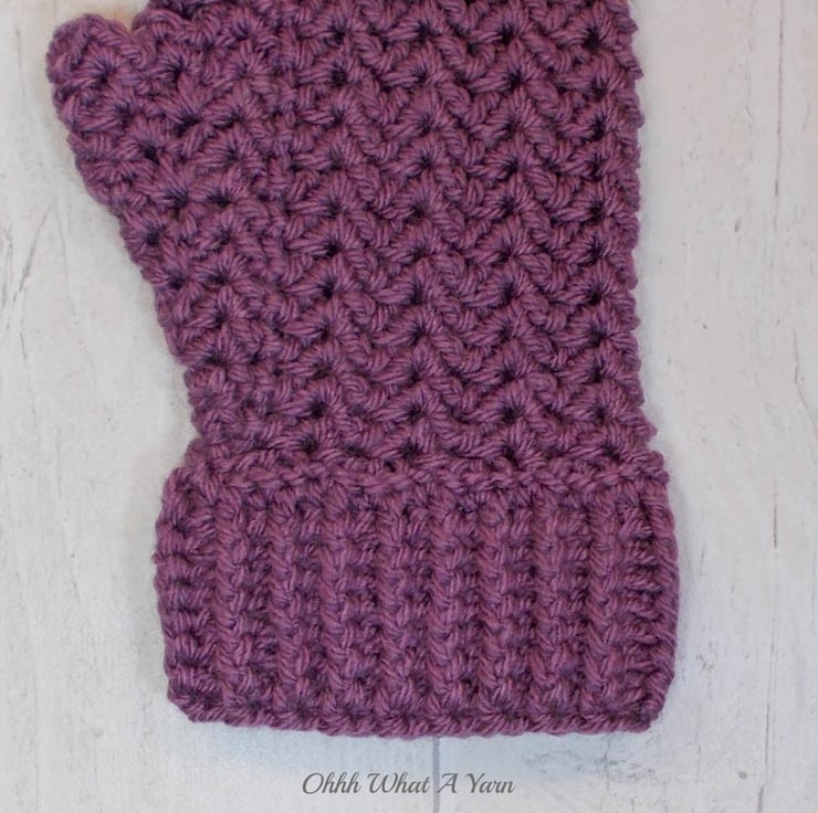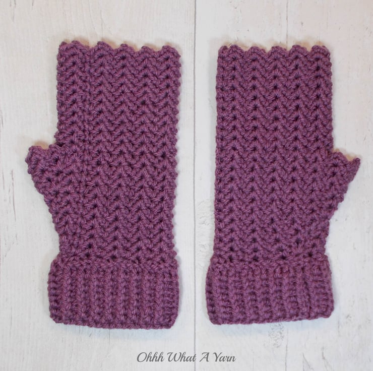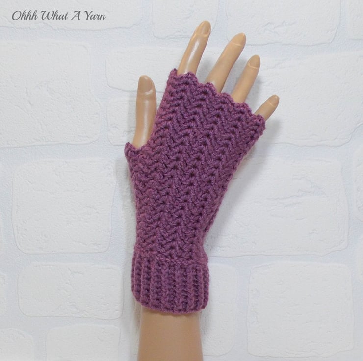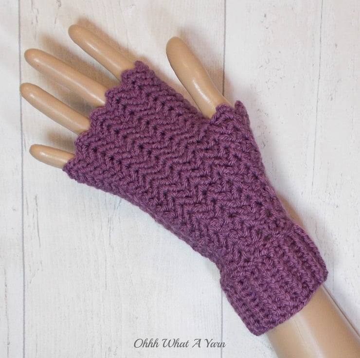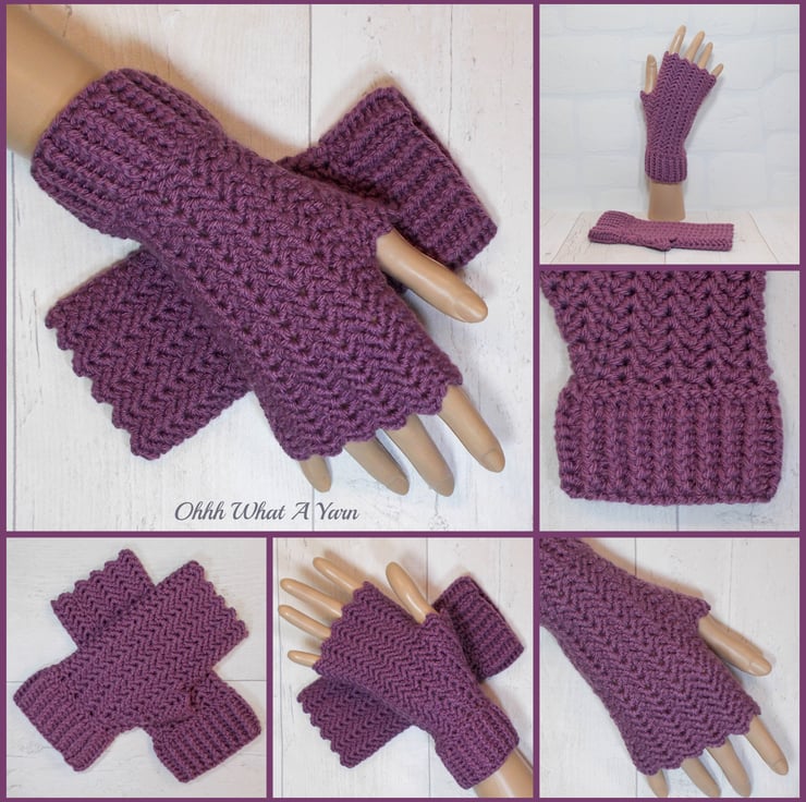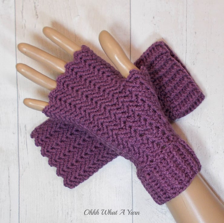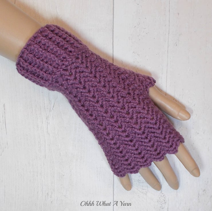 These pretty and practical ladies’ fingerless gloves have a lovely v stitch pattern which creates a gorgeous texture. They have a deep ribbed cuff.