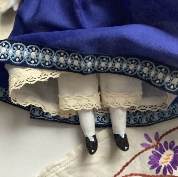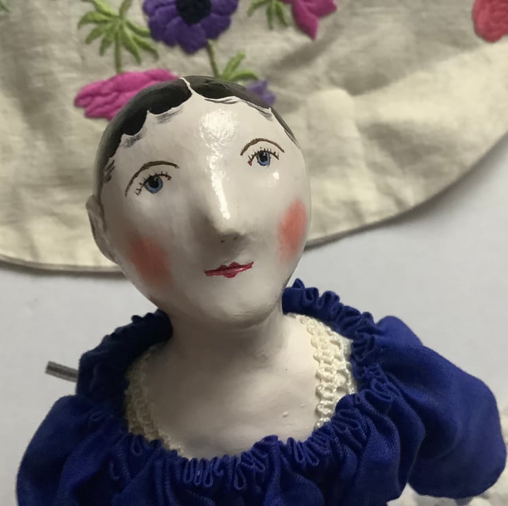 Based on traditional china-headed dolls of the Victorian era, Henrietta is a lovely 27cm high doll with clay head, lower arms and legs individually hand modelled and painted. Her black hair is painted and modelled into a bun at the back with a painted blue ribbon. She has dainty little painted black boots and painted blue garters. Her body is handmade from calico and she is fully dressed in long lace-trimmed drawers, matching petticoat and a dress of very fine royal blue muslin. Henrietta is a doll for collectors only and is not a toy.