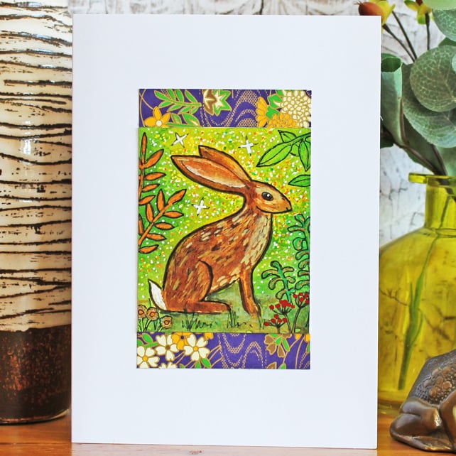 The matching handmade card features a painting of a hare which has been created using acrylic paints and inks on watercolour paper. Strips of origami paper have been added to the top and bottom. Both the painting and the origami paper have touches of metallic gold which adds a bit of sparkle.