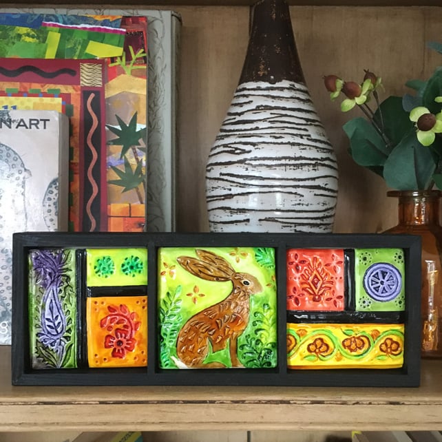 The artwork is housed in a small wooden box which has been painted with black acrylic paint. I've made three polymer clay tiles to fit in the compartments. The tiles have been debossed with a range of patterns and then layers of glass paints have been used to add colour and lustre.