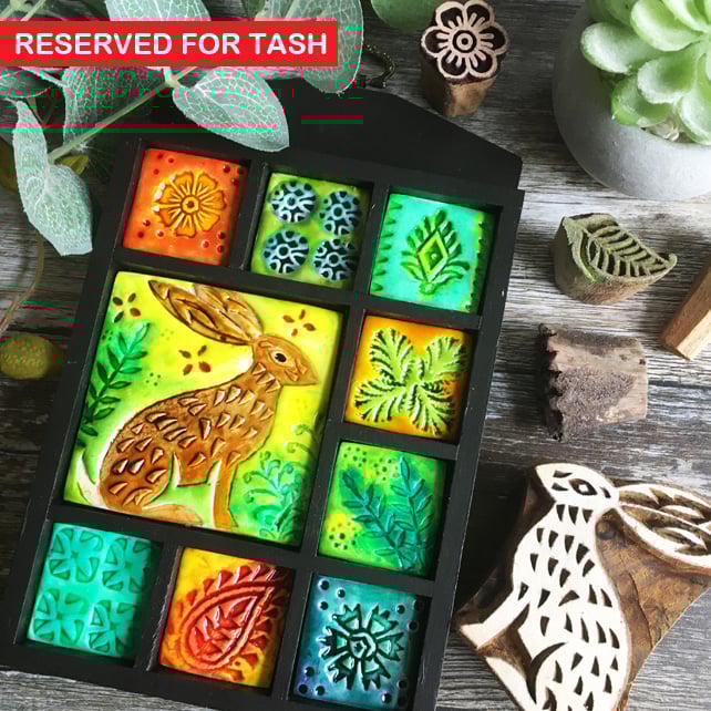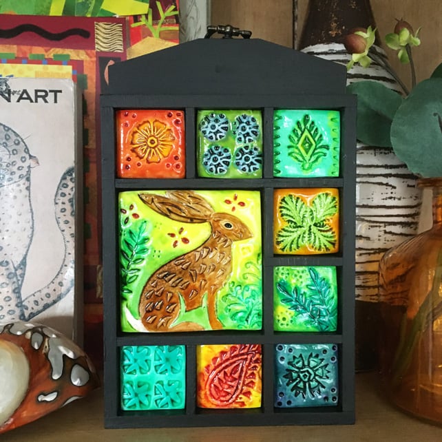 The artwork is housed in a vintage wooden thimble rack which has been given a coat of black acrylic paint. Polymer clay tiles have been made to fit each compartment and debossed with a range of patterns and designs. I've used layers of glass paint to add colour and lustre.