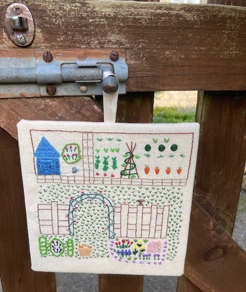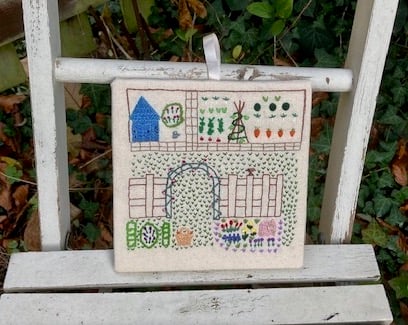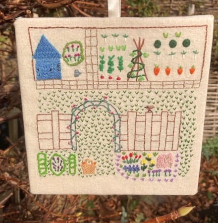 This delightful picture of a cottage garden with its flowers & vegetables has been hand embroidered onto cream calico material and mounted onto art board to create a little picture (18cm x 18 cm). The back of the picture is encased with calico material and there is a small piece of cream ribbon to hang the picture up with.
