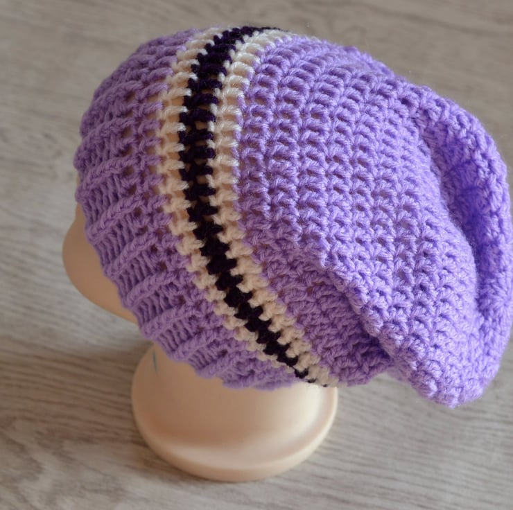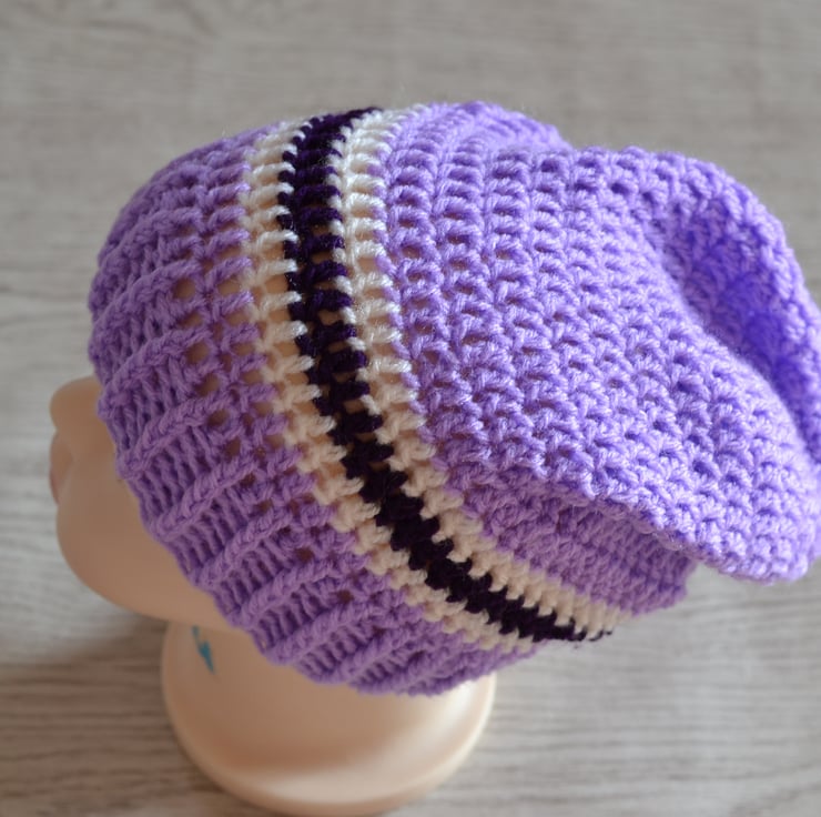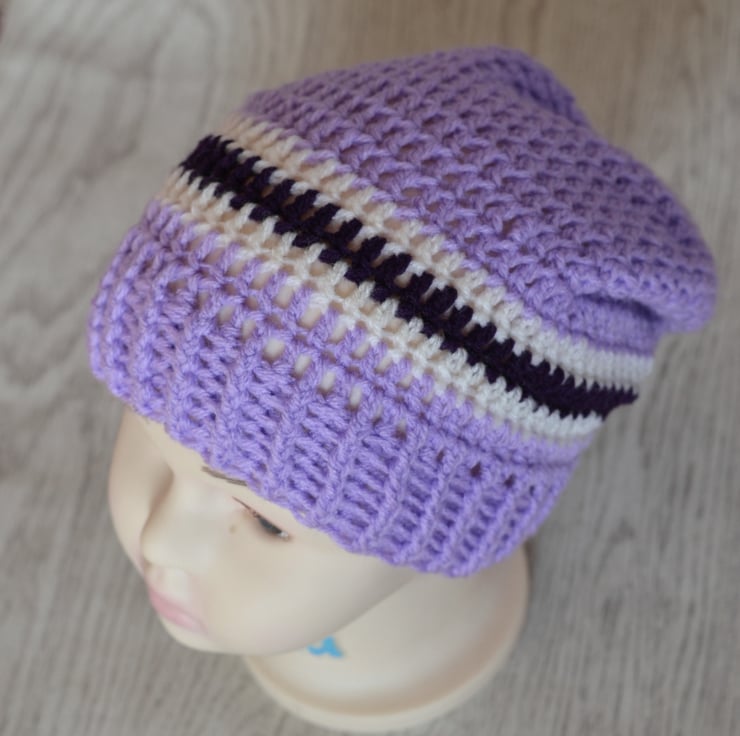 This delightful hat is made in acrylic in a lovely lilac shade. It has a cream and purple stripey bands to make it more striking.