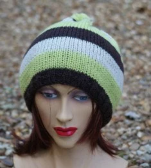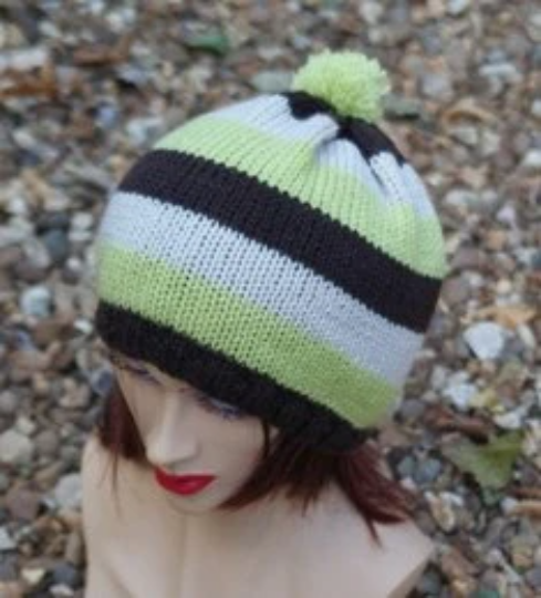 Knitted in 100% acrylic in stone, pea green and brown in a stripey pattern It is knitted in dk yarn which makes it a better hat for those that don't like thick hats.
