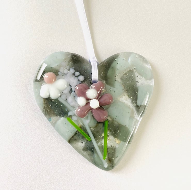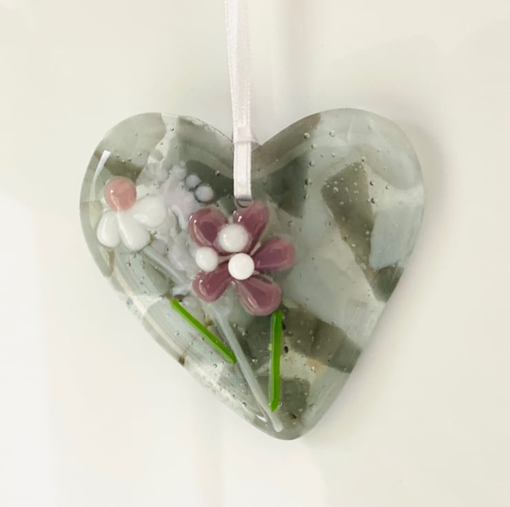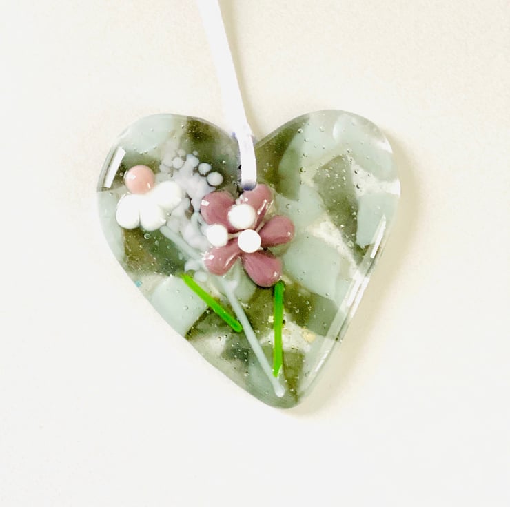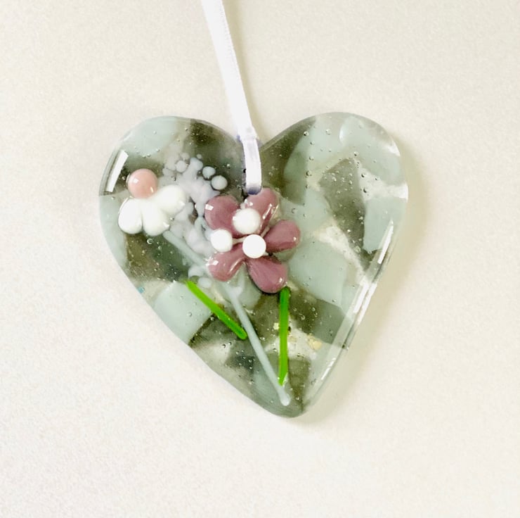 Pretty cast glass hanging heart which is approximately 3.5 in diameter .and 1/4 inch thick . Drilled and strung with white satin ribbon . Transparent glass allows the light to transmit through . A nice gift