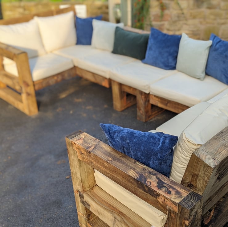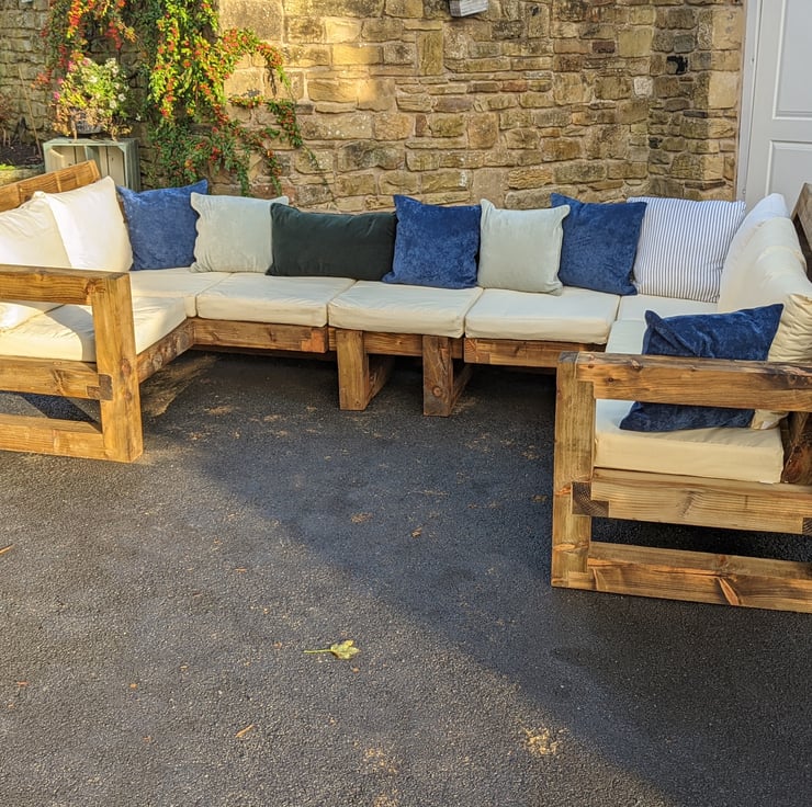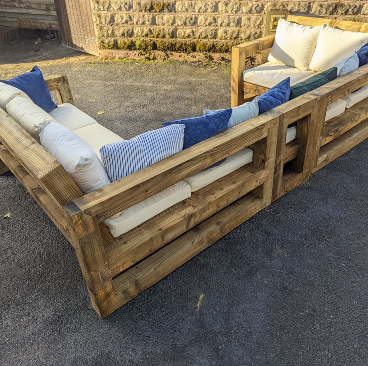 A Full handmade to order garden furniture set Comprising of a 3 Seater Corner Sofa, a 2 seater corner sofa & a connecting bench maing a massive wrap around set able to comfortably fit 6 adults or 8 if you'd like to get cosy in the corner sections! With everything being so chunky there's plenty of room on the chair arms to place your cold beverages!