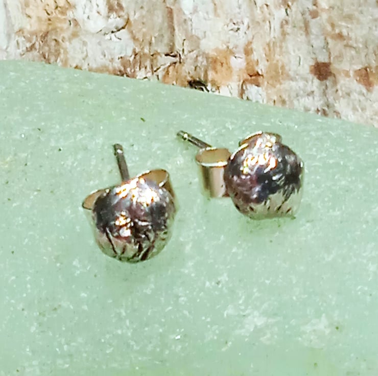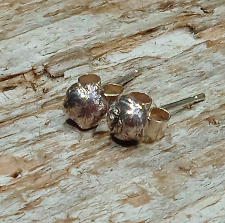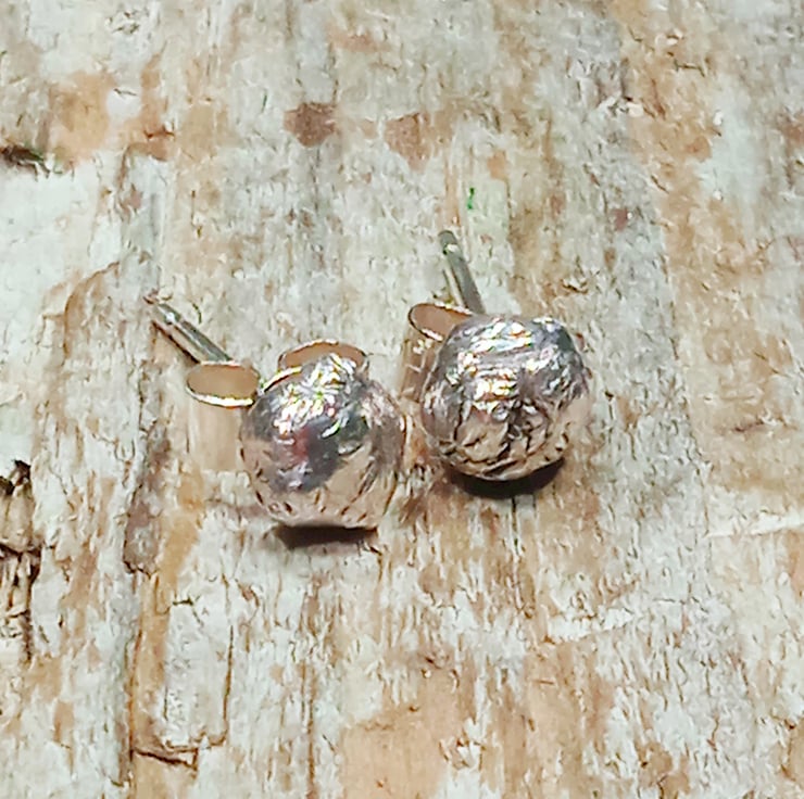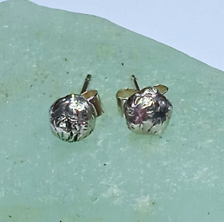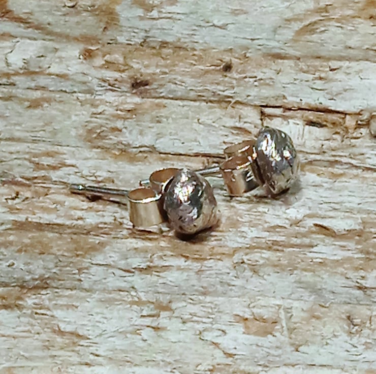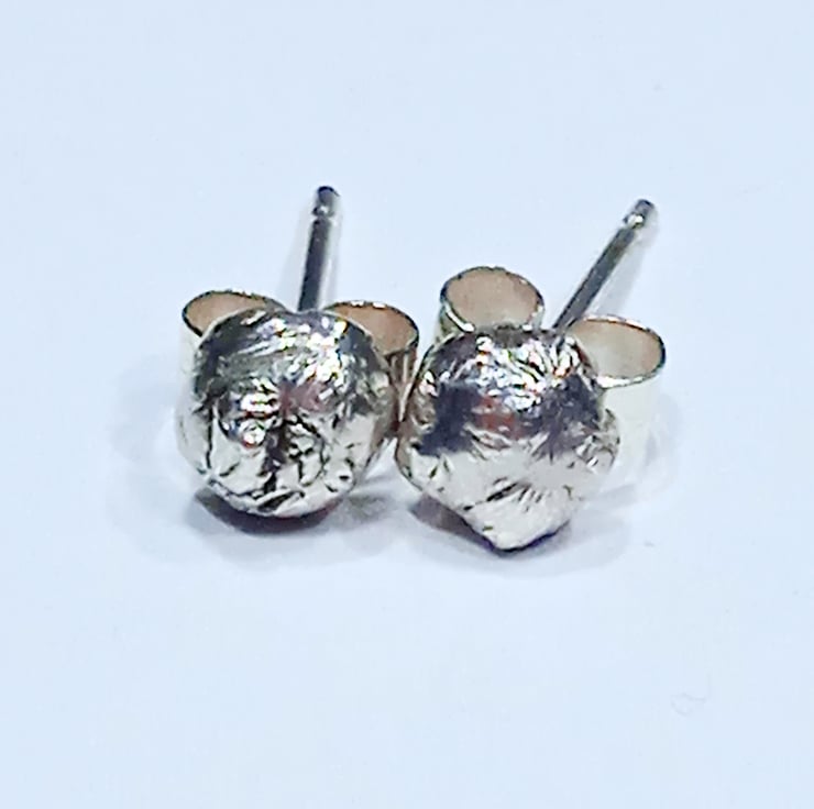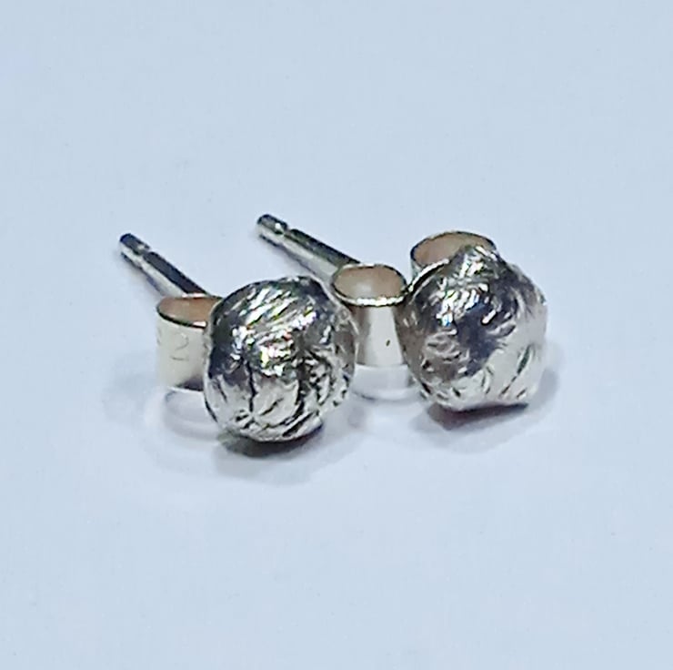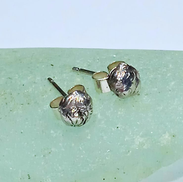These beautiful little hand crafted sterling silver earrings have an attractive irregular finish created by melting reclaimed sterling silver and dropping it into water. This creates organic, abstract shapes and surface patterns.
