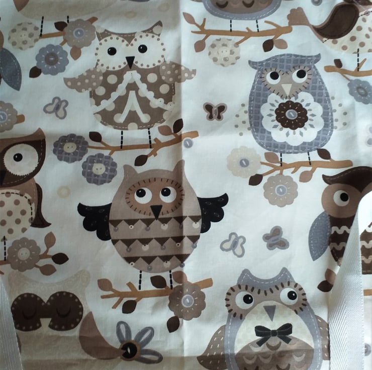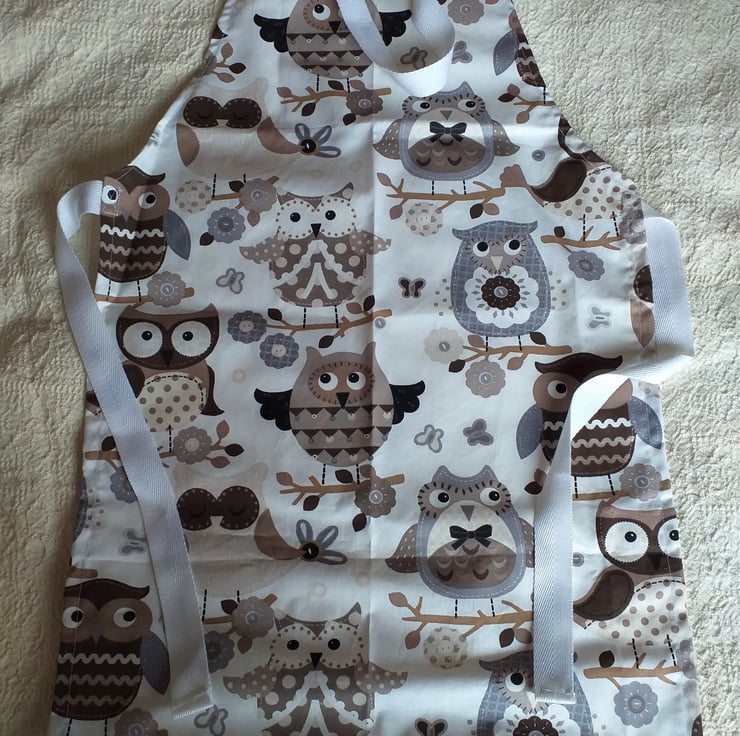 I couldn't resist this beautiful cotton fabric, which I have made into children's aprons with acrylic webbing straps. It is off-white with stylised owls printed on it in various toning shades of brown. Each owl stands on a branch of its own. The apron measures 27" (68 cm.) from neck to hem, and 18" (46 cm.) at the widest point, and will fit a child from about 8-16 years, or even a small adult. The girl wearing a different apron of the same size is 13 years old. Her rather glum facial expression is explained by the words: Goths don't wear aprons, Grannie. The apron is machine washable.