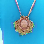The copper disc is about 3cm across, 29mm actually, and it is hung by a copper jump ring from a torc of silver wire which is 1mm in diameter. The wire is long enought to hang just below the collar bone on me. Fastened by two hooks formed at each end of the wire.