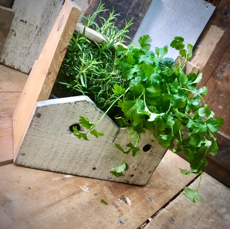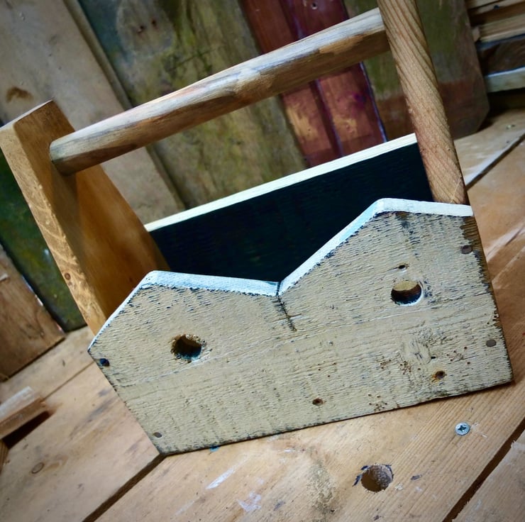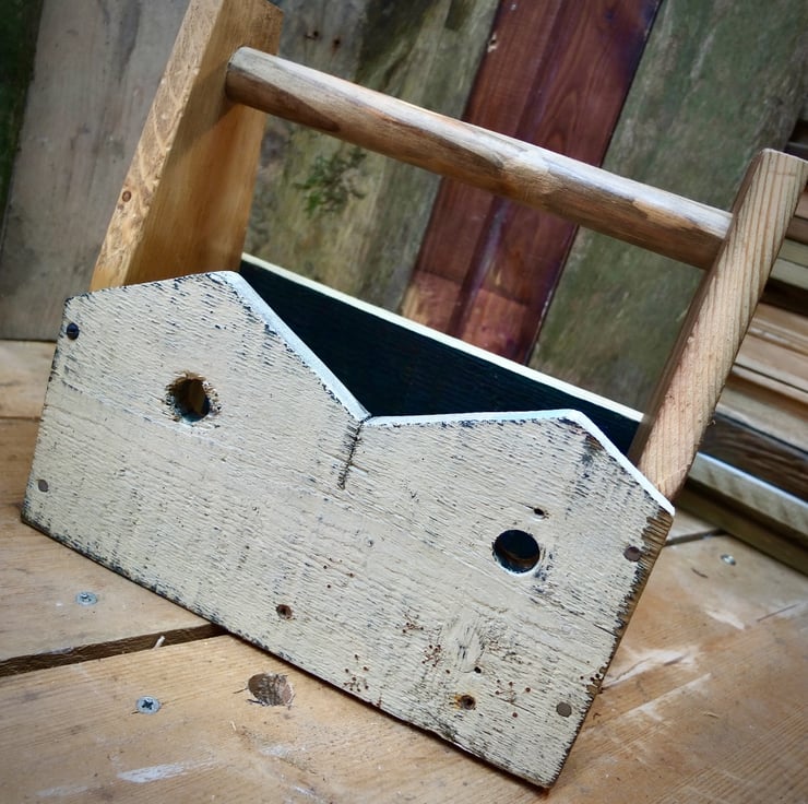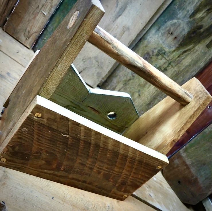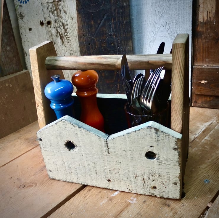 Handmade in the style of a primitive tool box, each of our rustic kitchen caddies is unique because it's constructed using a variety of different timbers we have reclaimed whilst restoring our ancient Devon farm. Hand sanded and finished in wax, our kitchen caddies are ideal for carrying condiments, herbs, drinks or as a decorative storage feature around the home. The body of this kitchen caddy is constructed from a variety of different reclaimed pine fascia boards and the handle is made from a reclaimed pine stable broom. This kitchen caddy measures 156mm deep, 289mm wide, 277mm high.
