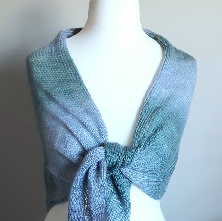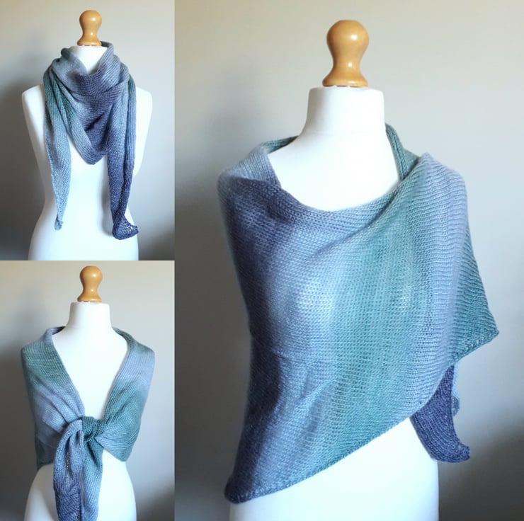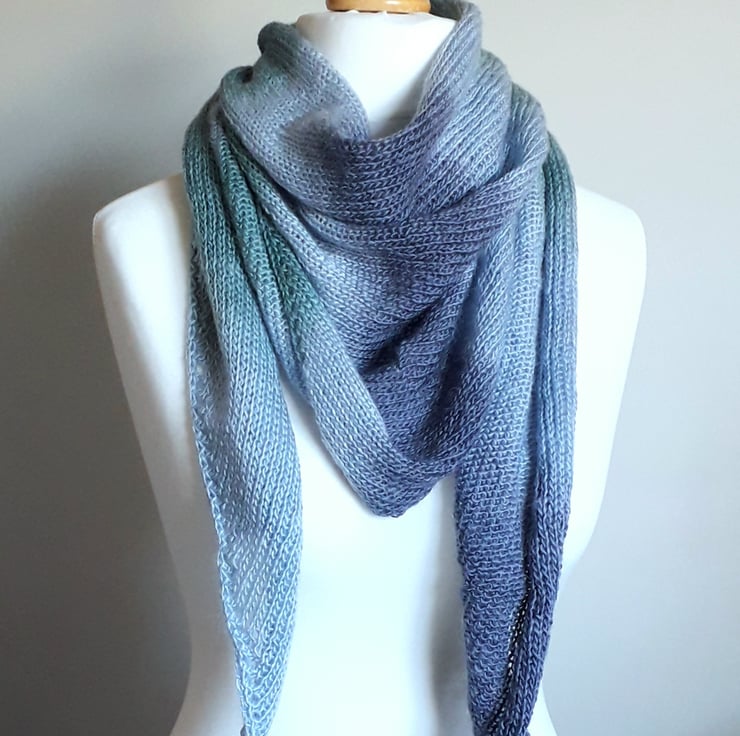 This triangular shawl is beautifully soft and light, but also very warm and cosy. It has been lovingly knitted on a hand operated knitting machine using a beautifully soft blend of alpaca and acrylic yarn in gentle tones of blue and green.