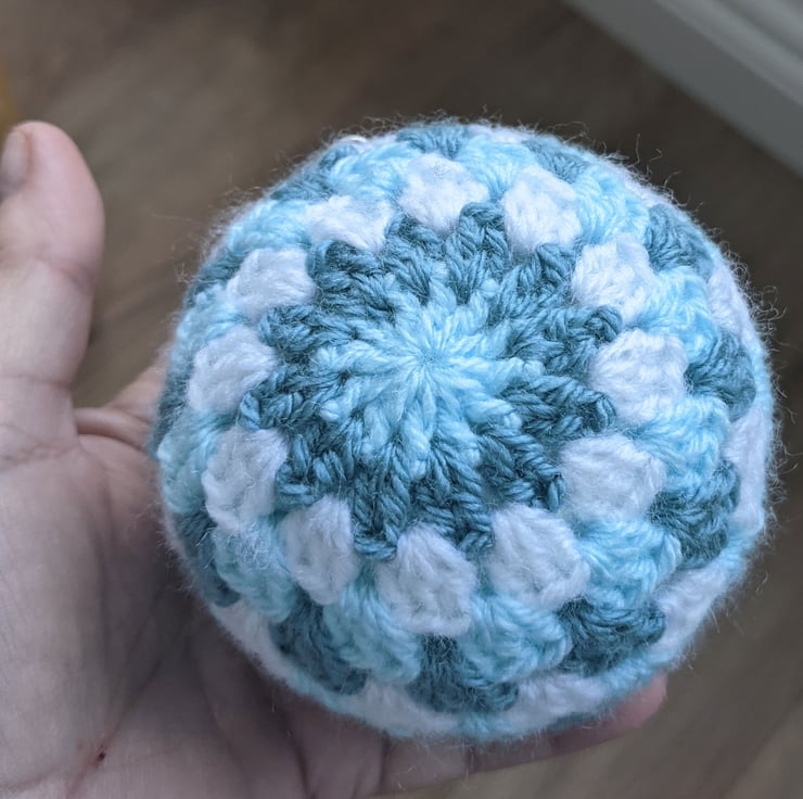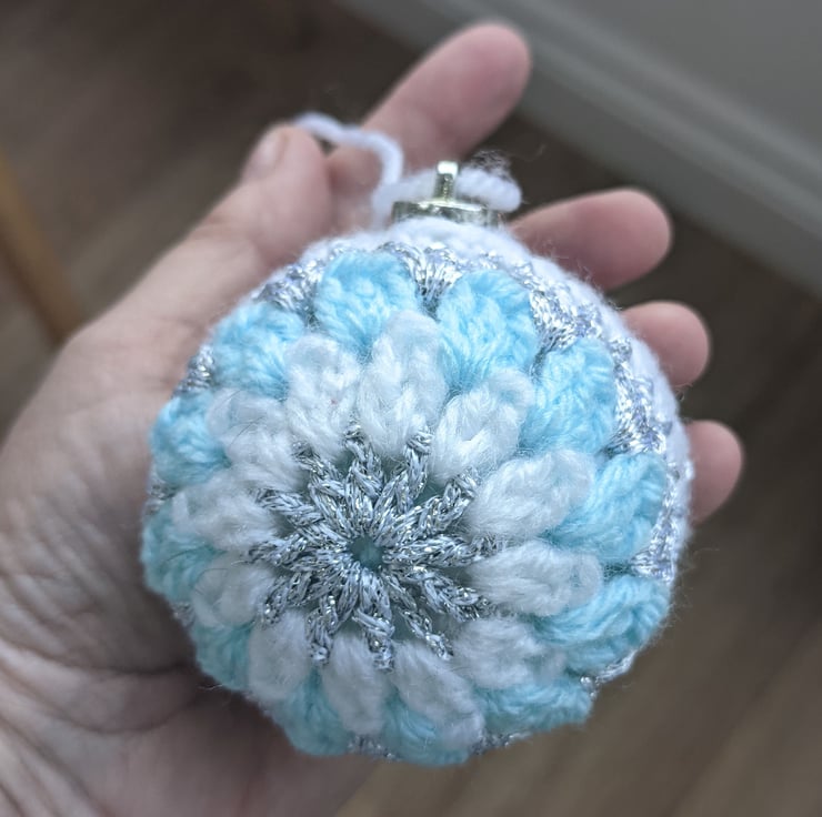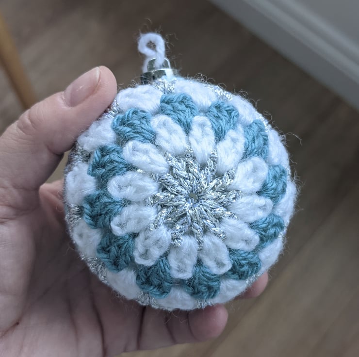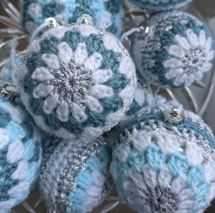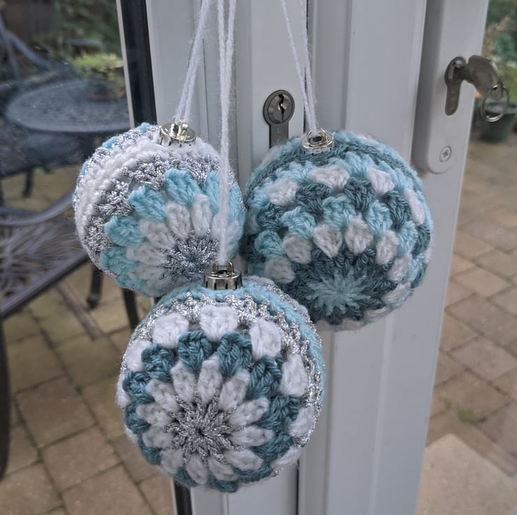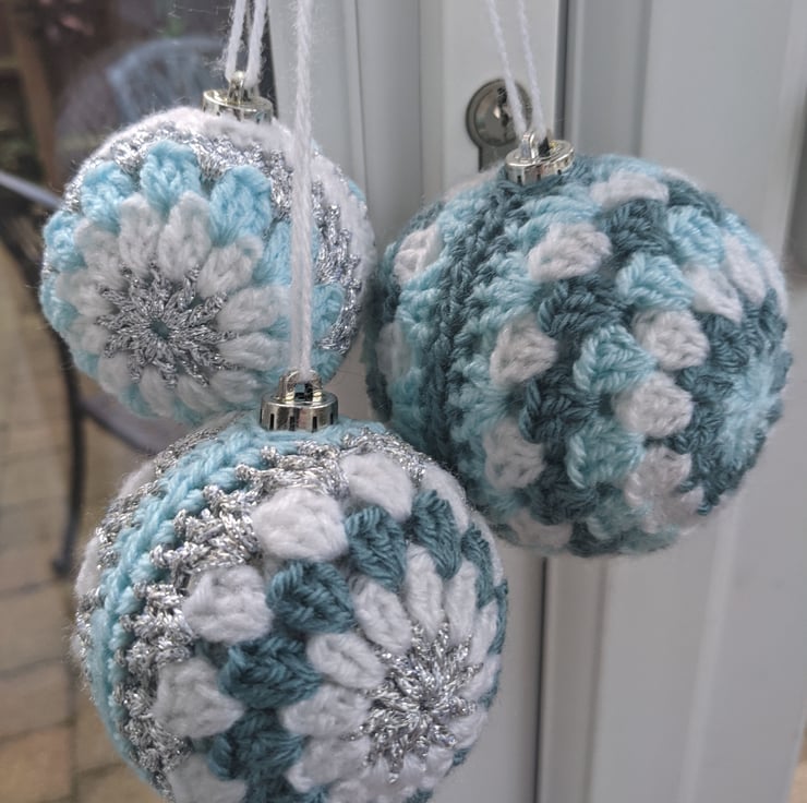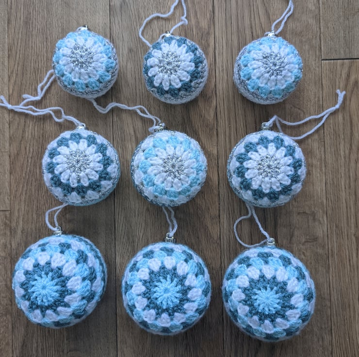 I made this set from a pack of shiny plastic baubles I found in a charity shop. I covered the baubles with crochet, in a pattern based on the traditional 'granny square' so they have a homely, handmade, retro feel. I used acrylic yarn left over from other projects in a mixture of white and two shades of blue, and included some silvery metallic thread on the smaller baubles to add a touch of sparkle.
