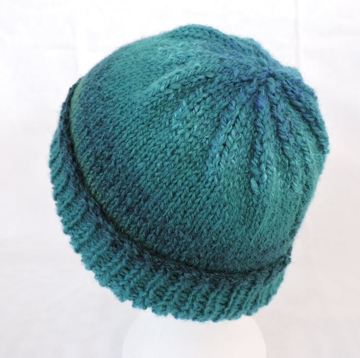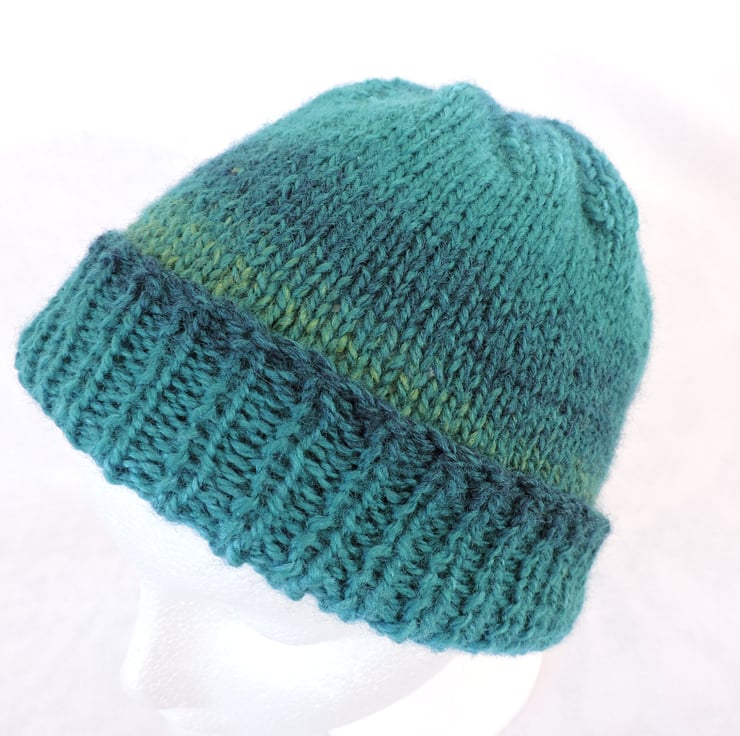 This adults beanie hat has been knitted with a soft chunky self striping acrylic yarn in graduating colours of teal and sea green. It has a ribbed brim with a stocking stitch body. A soft and warm hat, a perfect winter warmer to keep you snug in the cold weather.