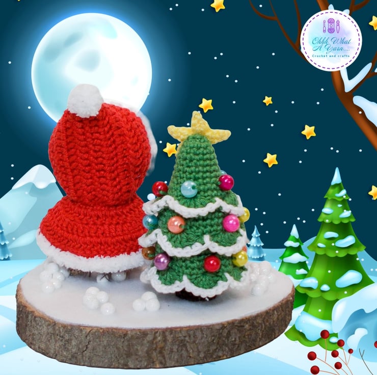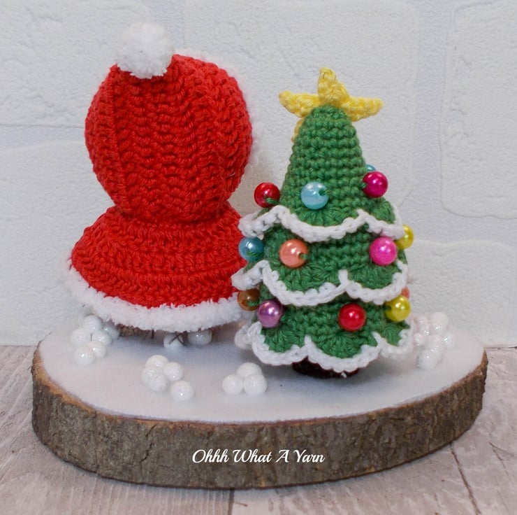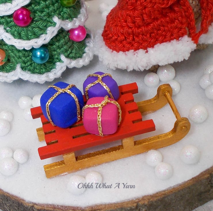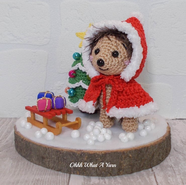 She is standing on a log slice measuring approx. 15cm in diameter and 2cm deep. The log slice is decorated with a crocheted and hand beaded Christmas tree and white fleece snow with snowballs and a little red and gold painted sledge complete with polymer clay presents.