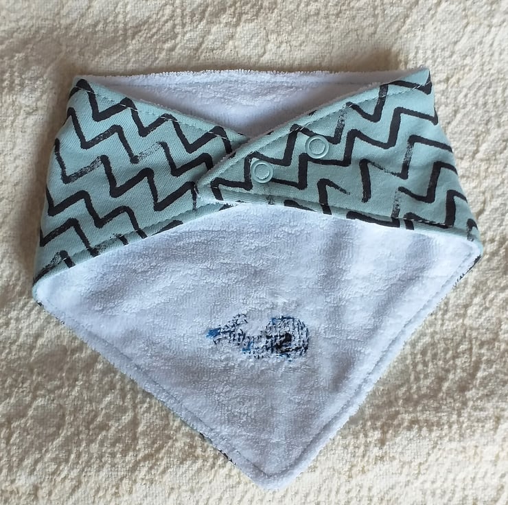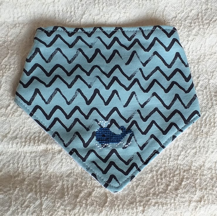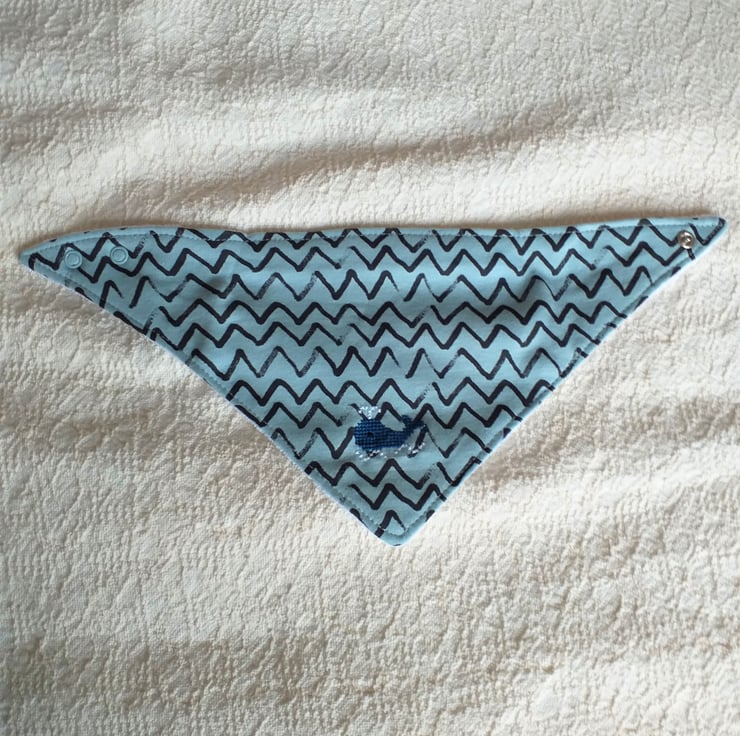 I love this little triangular dribble bib. I have hand stitched a smiley blue whale on the bottom corner. He is spouting a spray of white water as he swims between the black waves printed on this blue-green bib. The bib is 100% cotton on the front, and cotton-polyester towelling on the back, with an adjustable press-stud fastening at the back of the neck. It is machine washable.