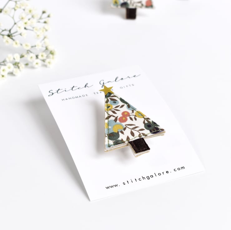 This pretty Christmas tree brooch is sewn using freehand machine embroidery and made from green festive Liberty fabric and wool felt.