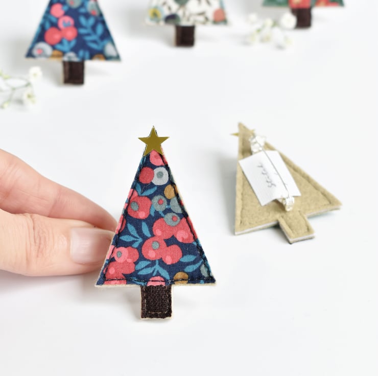 This pretty Christmas tree badge is sewn using freehand machine embroidery and made from blue festive Liberty fabric and wool felt.