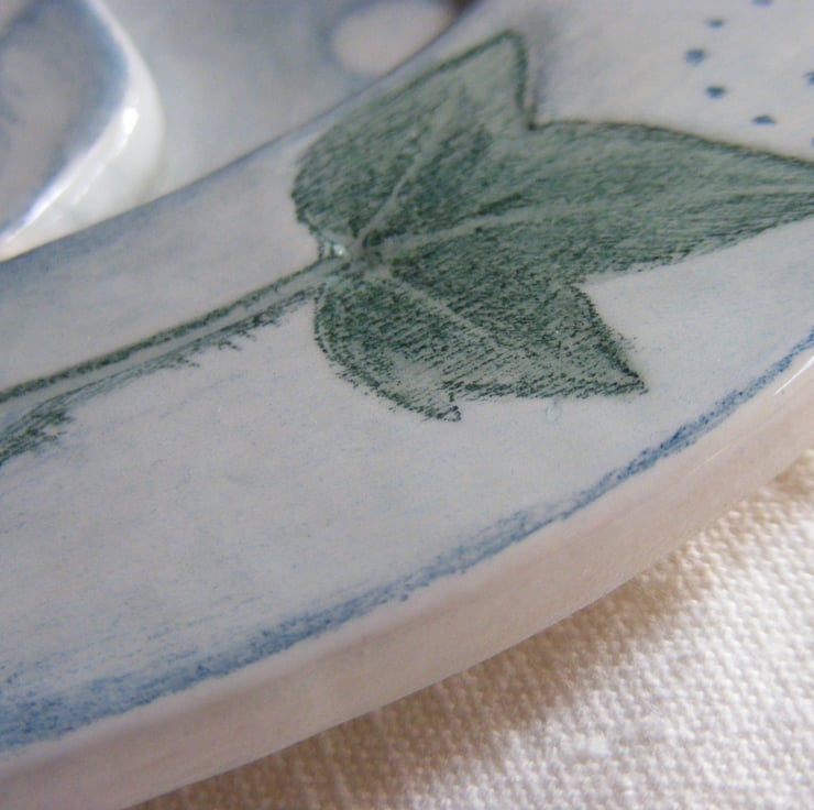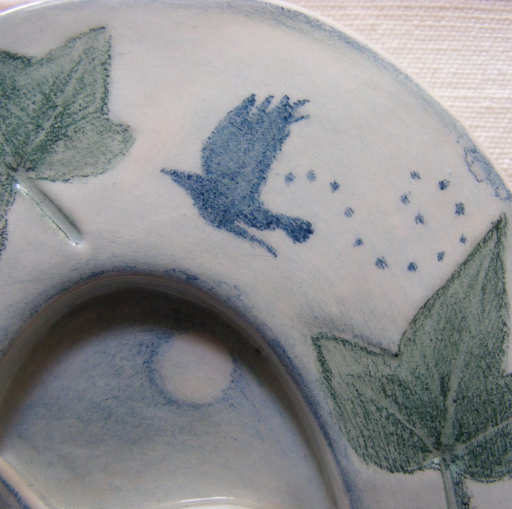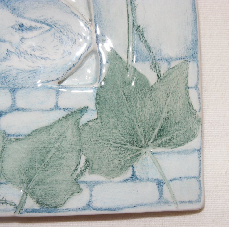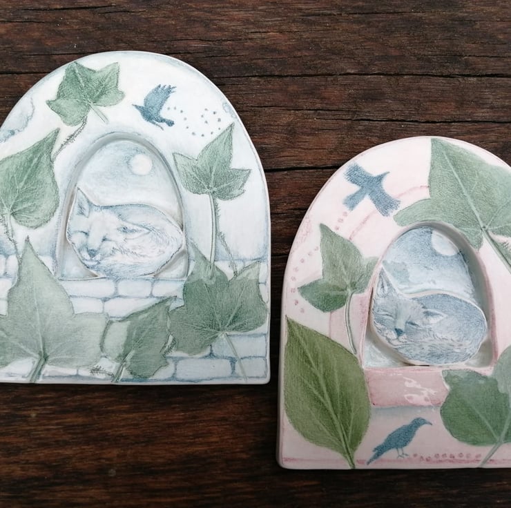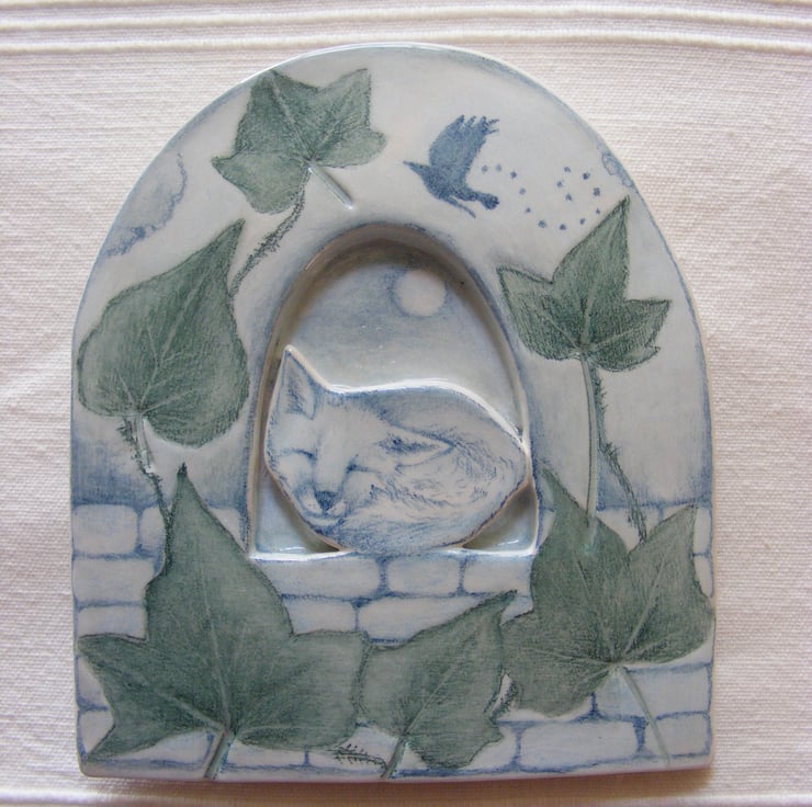 I love creating fox pieces in my ceramic work and this beautiful piece captures a sleepy fox dreaming of chasing crows. I was experimenting also with different styles of how to use the clay and came up with the little window in the arch idea. I used Ivy from my own garden to embellish the wall. Here, fox can take a short sleep basking in the light of the Full moon and dream of joyful times chasing crow.