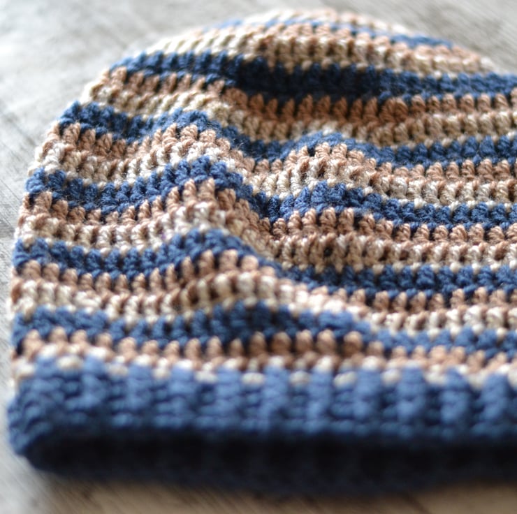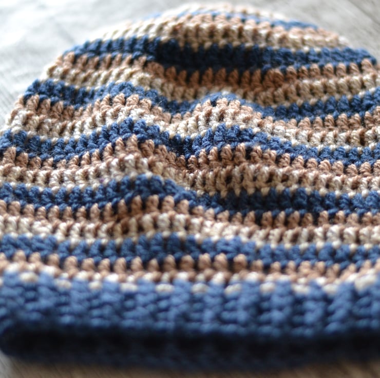 Clearance sale crocheted tam slouch hat in 100% acrylic yarn in denim blue, coffee and light beige.