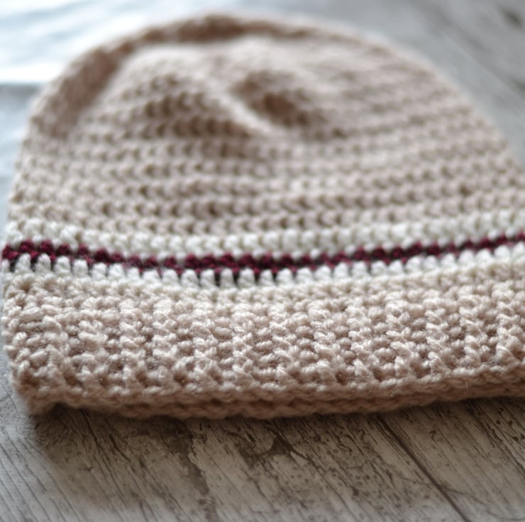 This delightful hat is made in acrylic in a light beige, cream and burgundy.