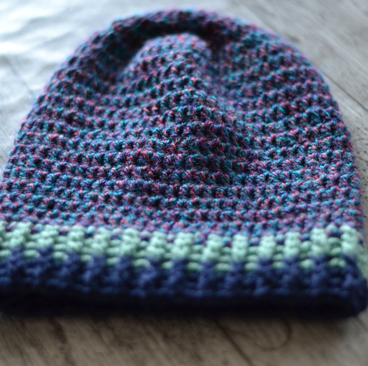 This delightful hat is made in acrylic with 25% wool fibres in navy, light teal and a marl yarn in shades of teal, blush pink and purple