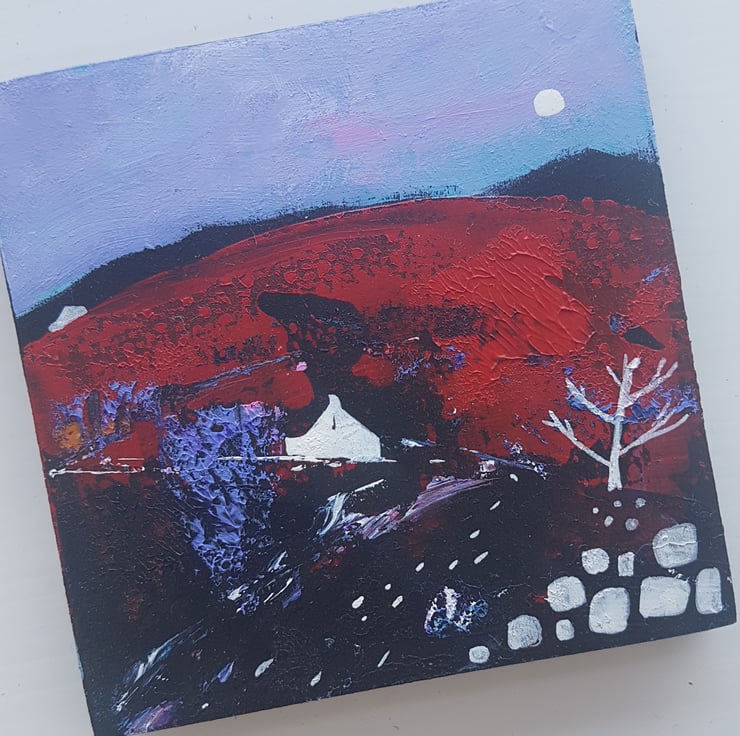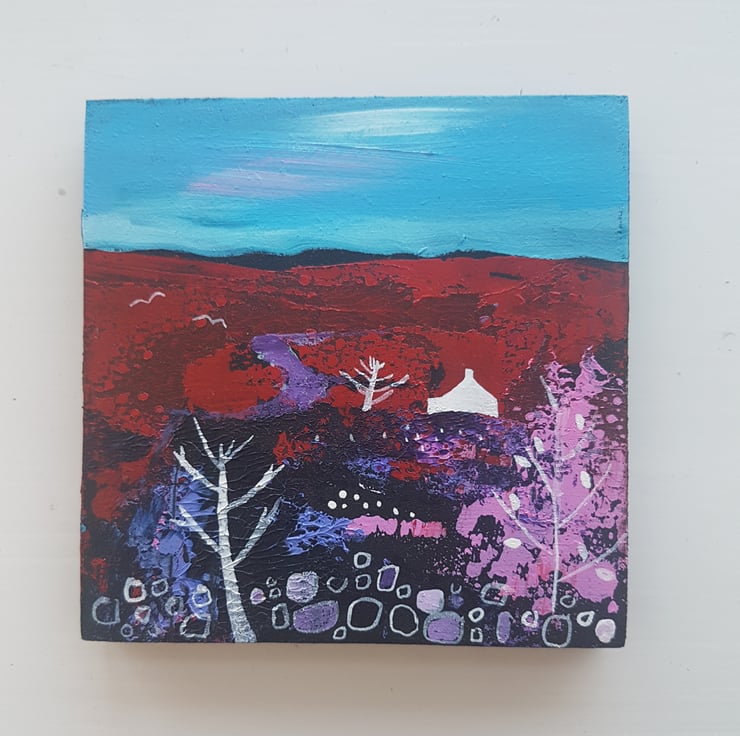 This 10 x 10 cm painting (1st image) is varnished signed on the back and has a hook ready to hang. Great to brighten up a small corner or to give as a gift.