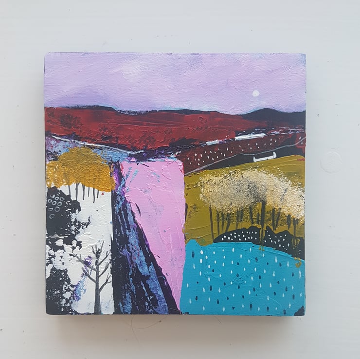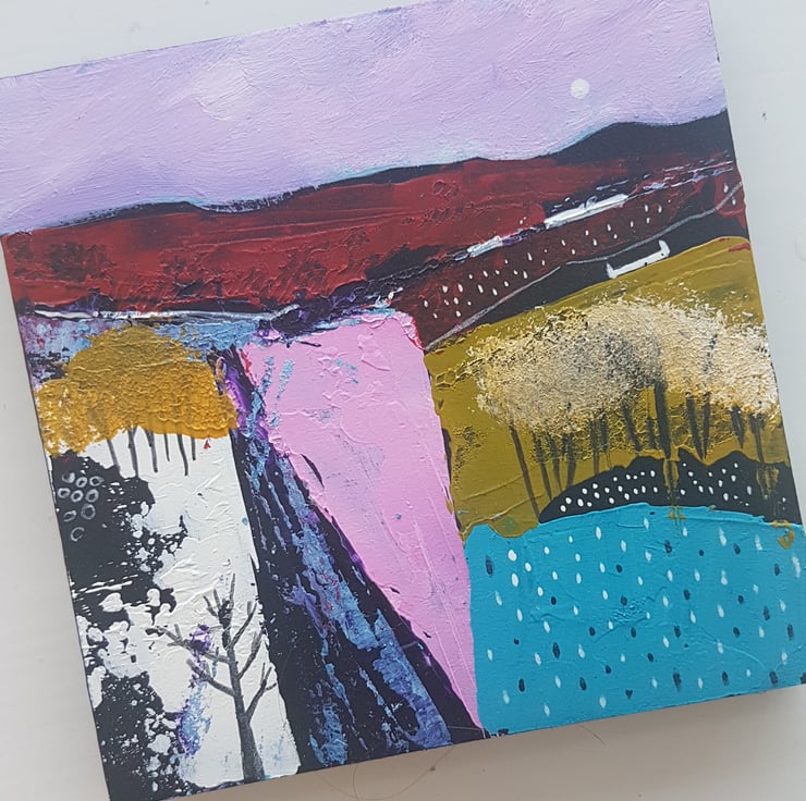This 10 x 10 cm painting (1st image) is varnished signed on the back and has a hook ready to hang. Great to brighten up a small corner or to give as a gift.