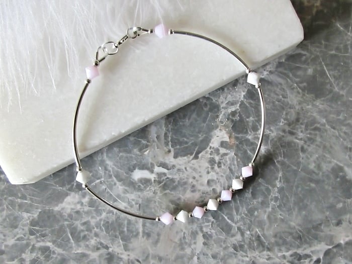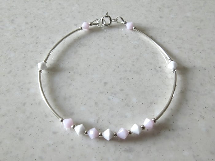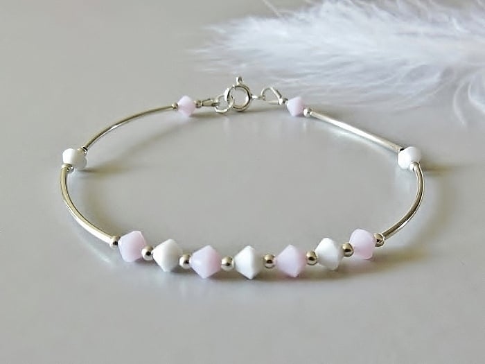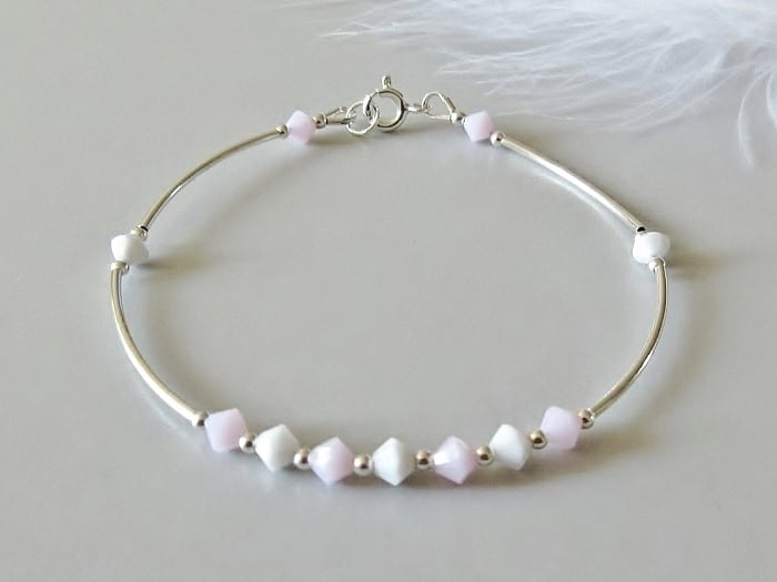This feminine crystals handmade bracelet has pretty 4mm pastel pink & bright white premium quality crystals from Austria.