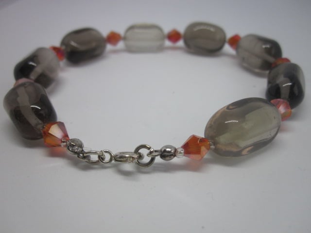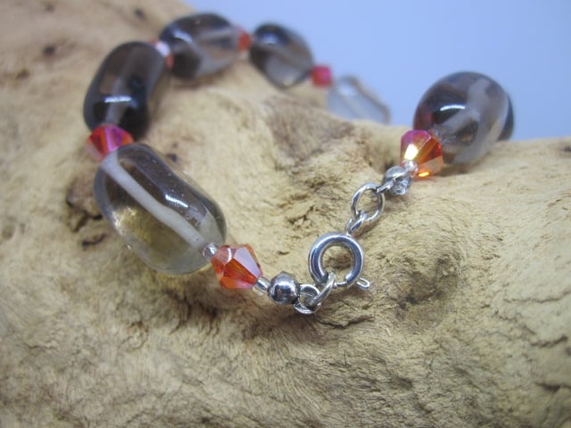 This bracelet is made using irregular shaped rectangular Smokey Quartz beads in various shades/hues, orange Chinese glass bicones and silver lined clear glass seed beads. The bracelet is approx. 8.75 inches in length and has silver plated findings. The clasp fitting is a bolt ring. This bracelet will arrive in a little organza bag. Gift boxed options available at checkout.