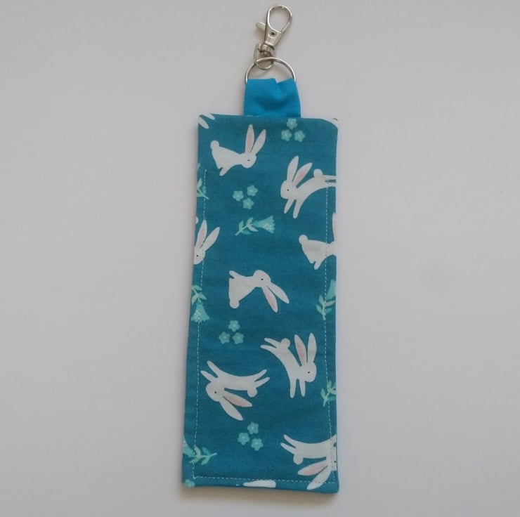 It has been made from a cotton fabric featuring a rabbit design, which has been interfaced for added stability. A split ring and swivel clasp are attached via a fabric loop at the top of the pen holder
