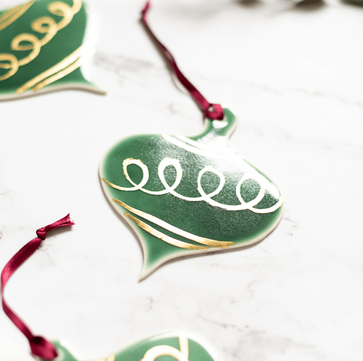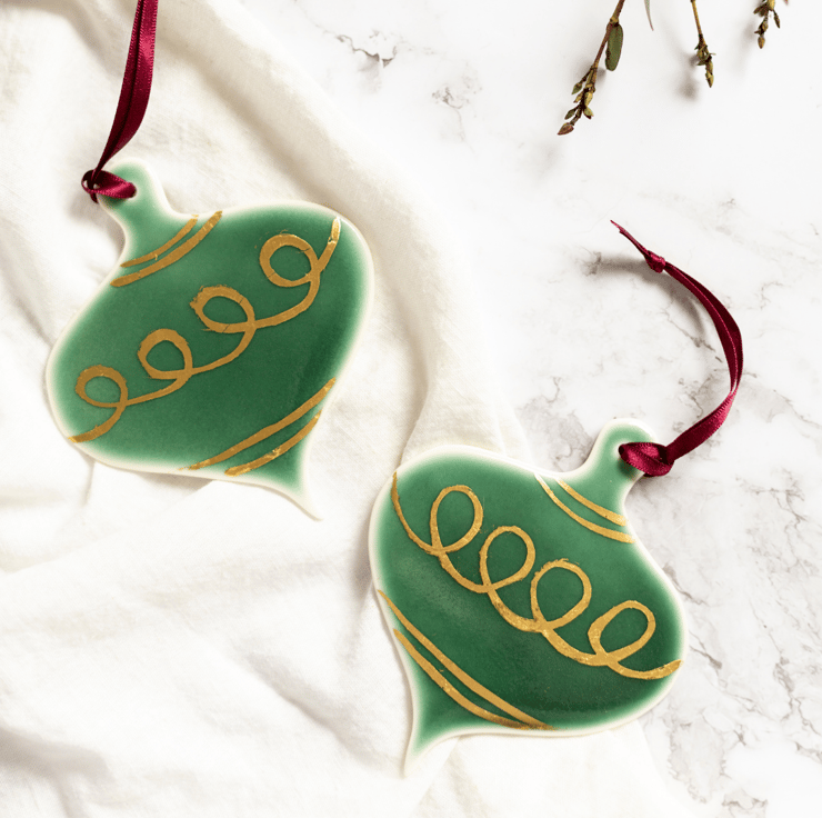 Glazed Porcelain Bauble - Green with Gold Loops - Hanging Decoration