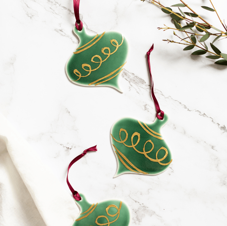 These Christmas decorations are cut by hand from a very thinly rolled sheet of porcelain. I leave them to dry slowly so they will remain flat. Once dry they go into the kiln for their first firing. When they come out of the kiln, two days later, I dip them in a shiny green glaze. After they have been back in the kiln for another two days to vitrify the glaze they are then ready for their gold leaf decoration.