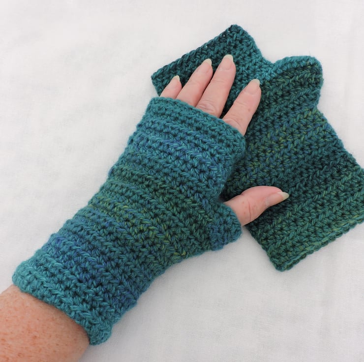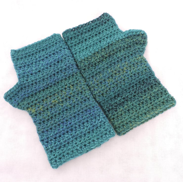 Sale I've crocheted these chunky fingerless mitts, gloves with a graduated colour acrylic yarn of teal and sea green. A warm soft winter warmer. Measurements are 7.5ins (19cm) from top to cuff, with 7ins (18cm) circumference. As with most crochet items these do have a bit of stretch to them.
