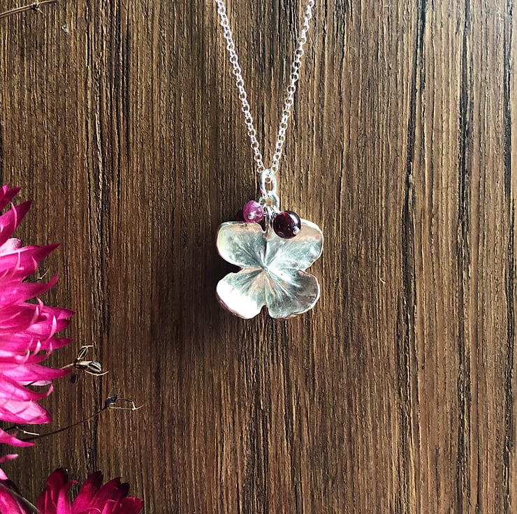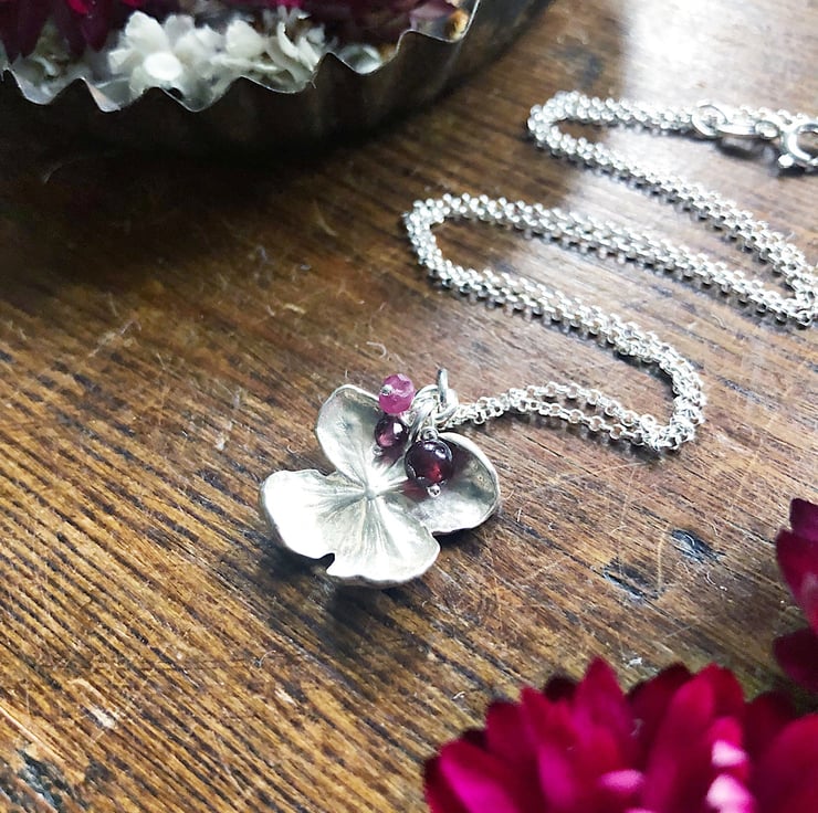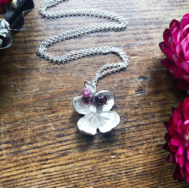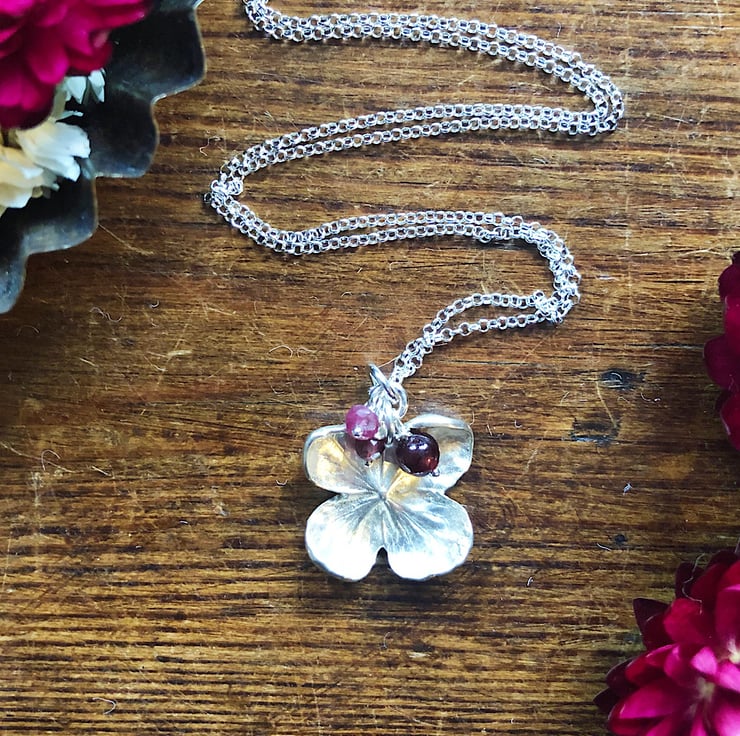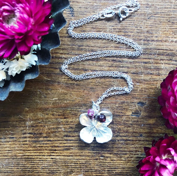 A pretty sterling silver hydrangea necklace with garnets and rubies. A lovely gift for a flower or garden lover.