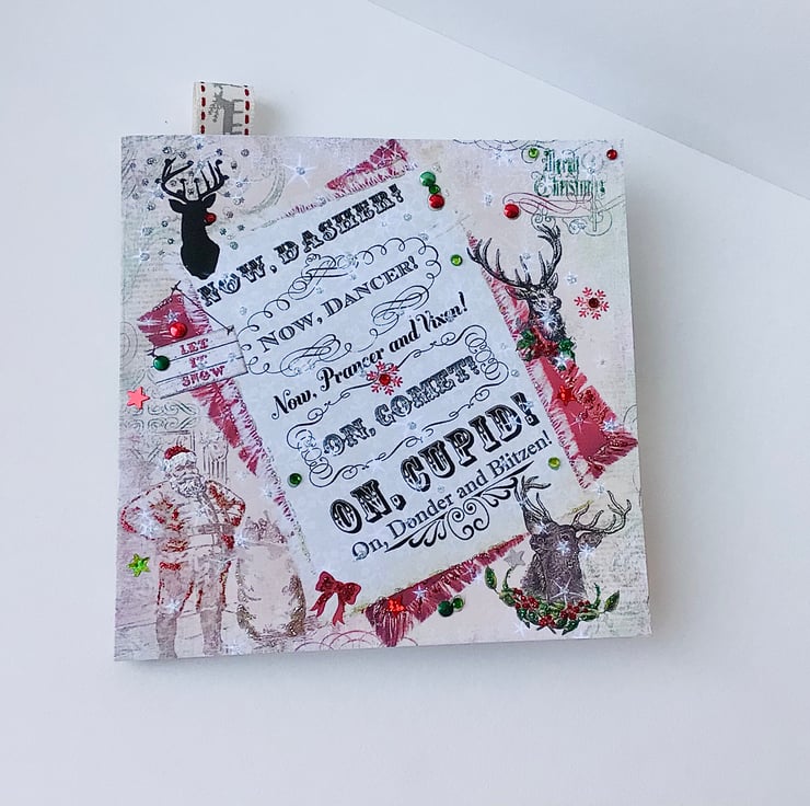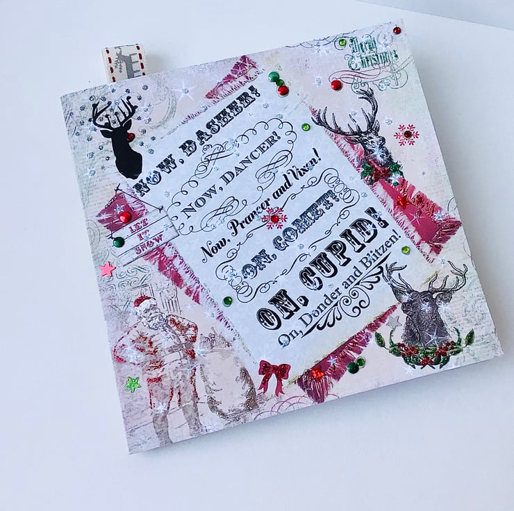 The listing is for a five pack of printed cards featuring a Christmas collage design which has been Handfinished with a selection of different embellishments including sequins, crystals, glitter paint and ribbon.