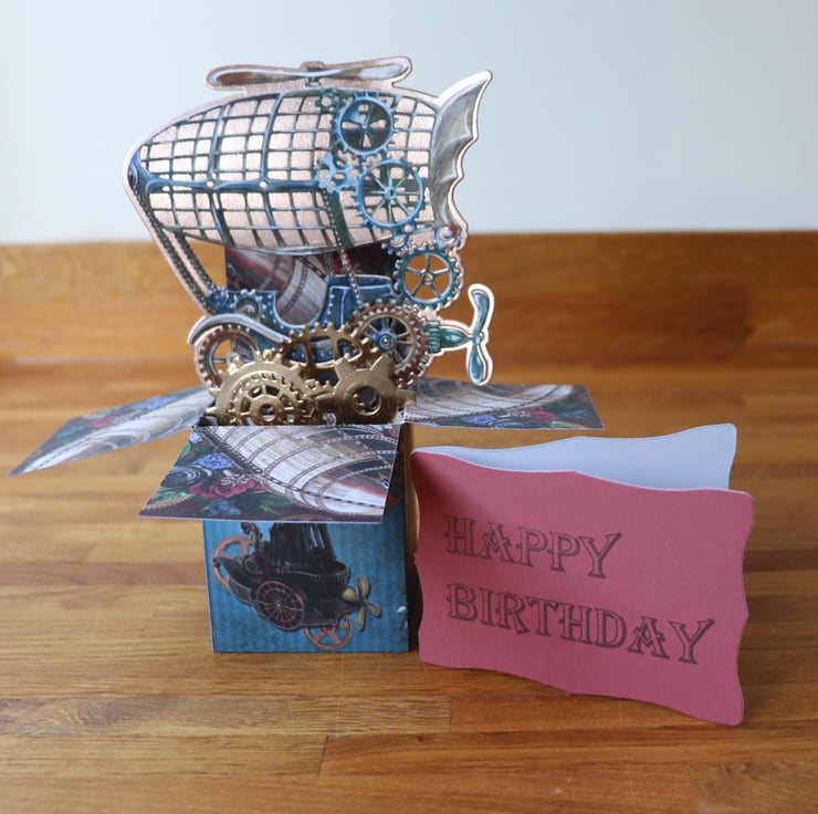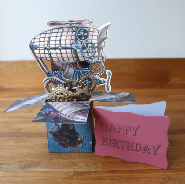 The greetings box card is decorated with a vintage air balloon and on the inside is a airship design, the main part is a airship and cog wheels.