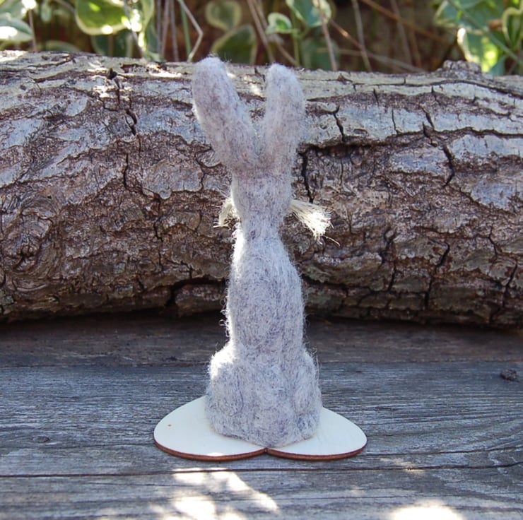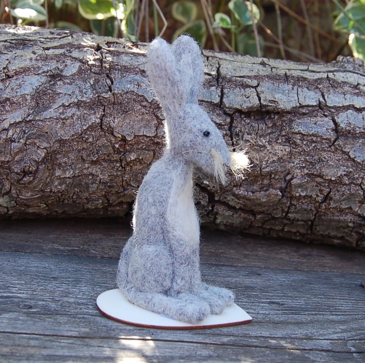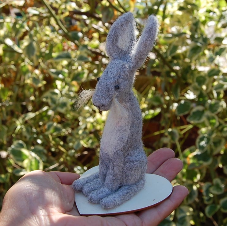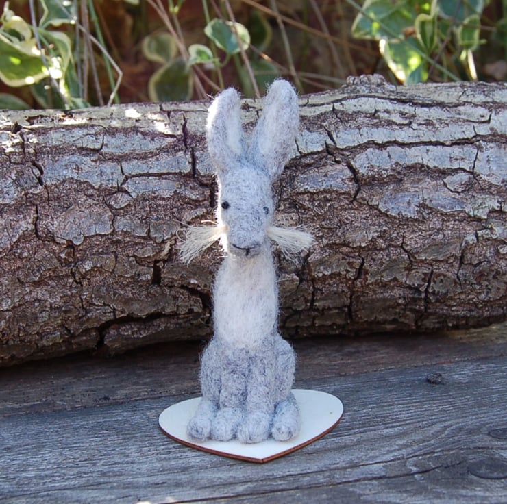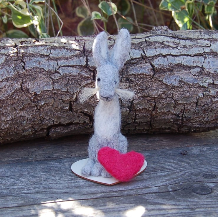 The hare measures 5.5 ins / 16 cm tall and is attached to a wood heart shaped slice. The red wool heart measures 1 ins across and is not attached.