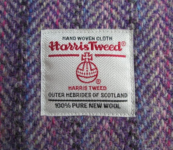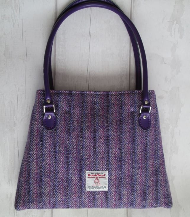 I've used the print as a feature panel on the front of the contemporary style bag and added amethyst purple, rolled leather handles. Inside, the lining fabric is pale lilac, with tiny white spots, and the surprising roomy interior includes a zipped pocket, a handy key hook and a magnetic fastening. The back of the bag bears the official 'Harris Tweed' 'Orb Mark' label that guarantees the authenticity of this unique heritage cloth.