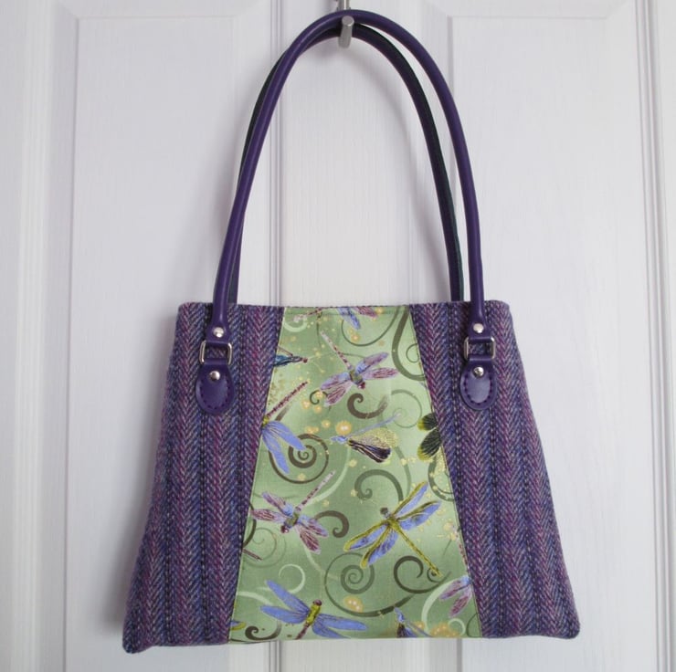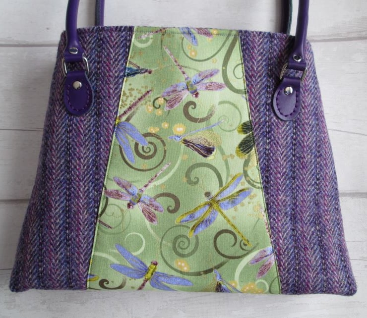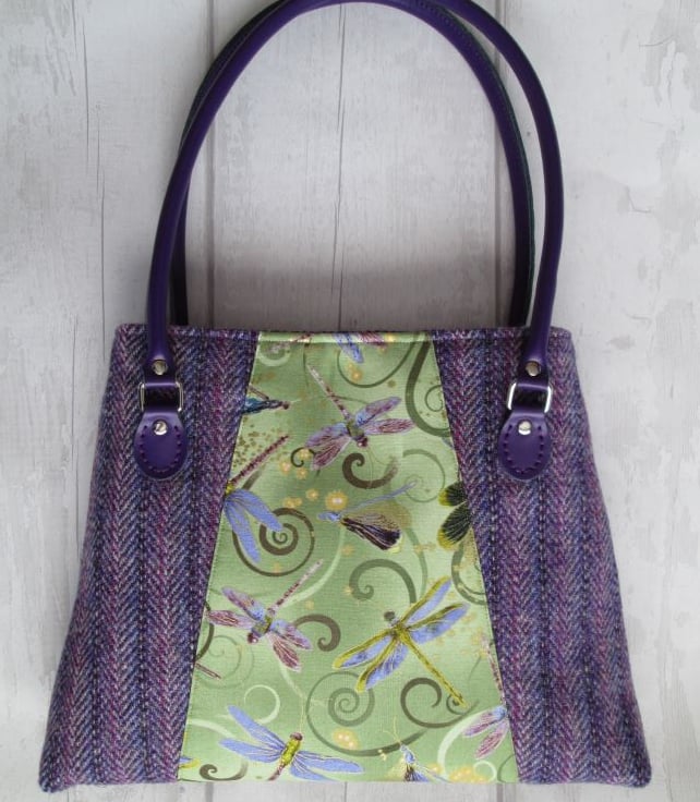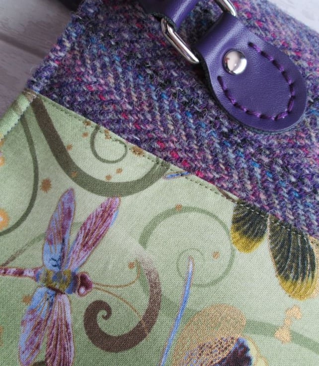 Sometimes you discover two fabrics that were simply destined to go together - in this case a length of beautiful 'Harris Tweed' in varying shades of lilac, pink and purple, handwoven by Gordon MacDonald (aka 'A Harris Tweed Weaver') on the Isle of Lewis, and a cotton print of matching pink and purple dragonflies on a soft green background, with metallic gold highlights - together they make one very special bag.