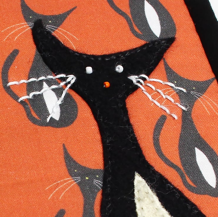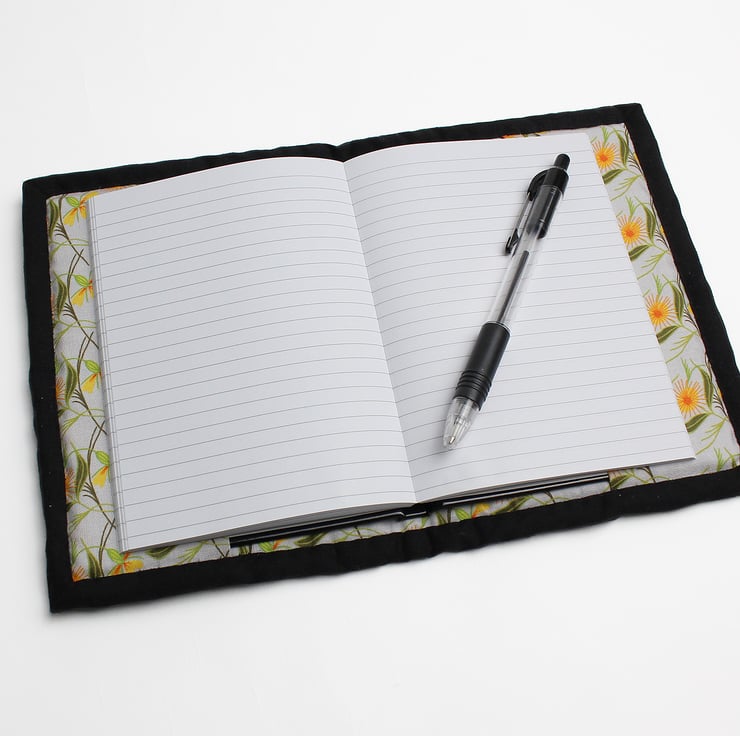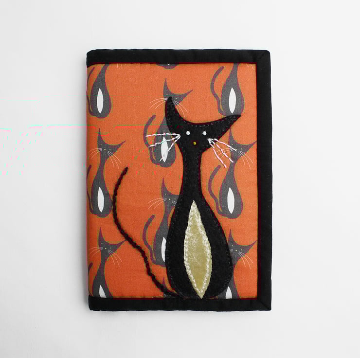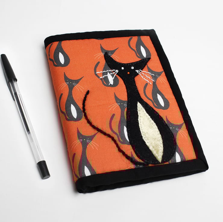 This A6 notebook is made my orange mid-century cat print fabric which as been printed on cotton. It has a hand appliquéd cat on the front in black with a beige tummy. The edge is trimmed in black poplin and the inside is trimmed with my own print, grey marigold . The notebook tucks inside the jacket so you can replace the notebook once it is used up. The item comes supplied with a lined A6 notebook. You can of course add your own notebook/diary/address book or journal.