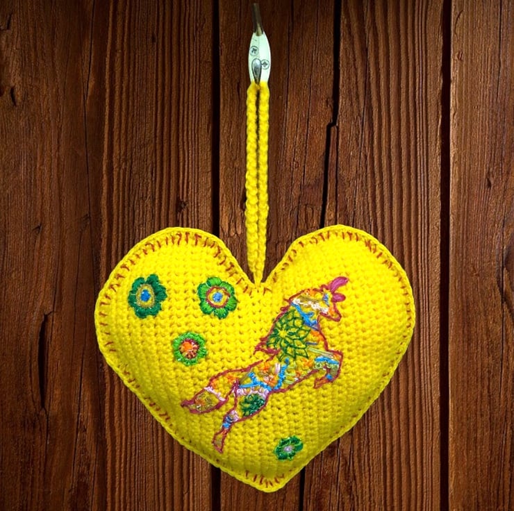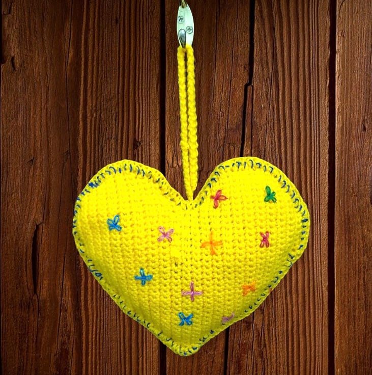 Main heart and fixed chord is made from yellow acrylic yarn.