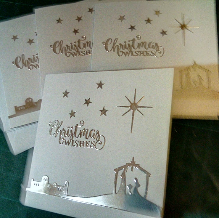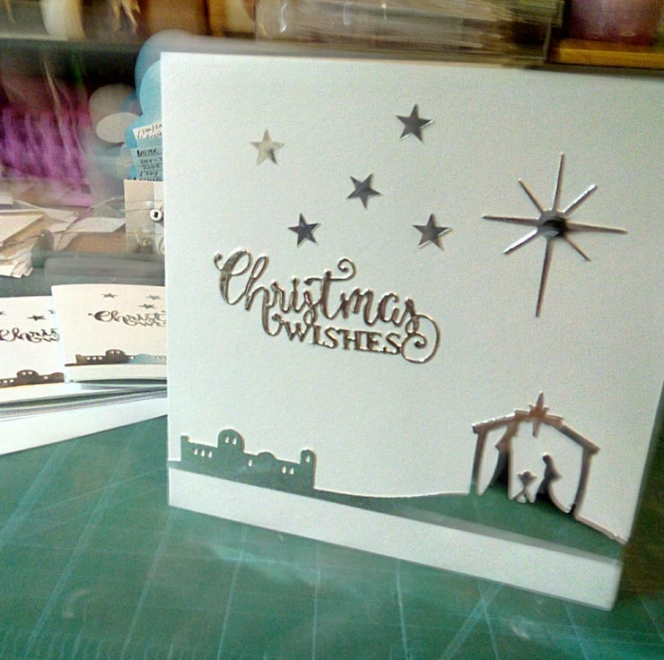 A pack of 4 same design Christmas cards. Completely handmade and uniquely designed. Consisting of Bethlehem and stable with Mary, Joseph and baby Jesus die cut from silver mirri card. Star of David above with a festive greeting all mounted onto quality pristine white linen effect white card.