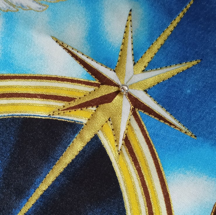 The backing fabric is midnight blue with stars in gold and pale blue.
