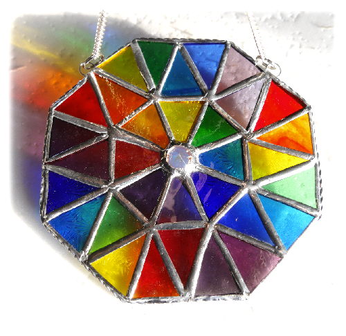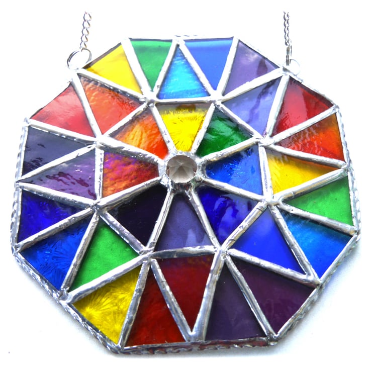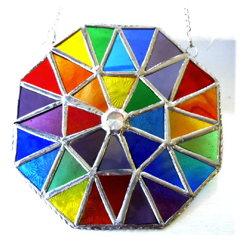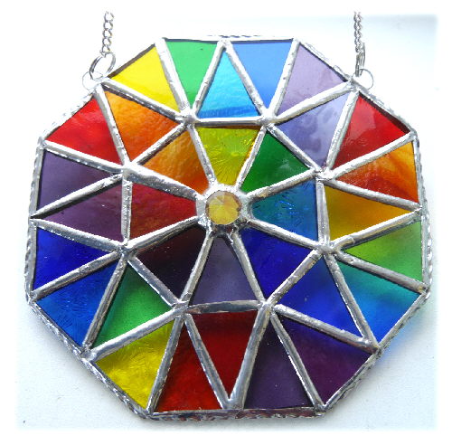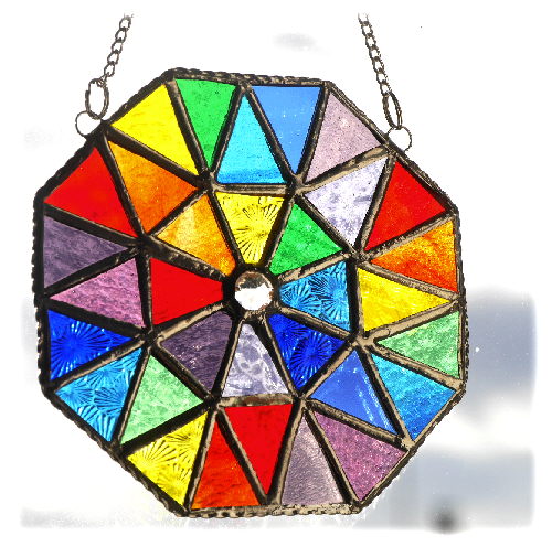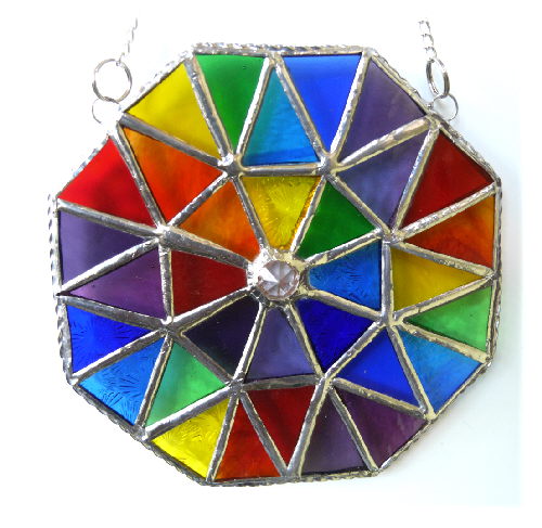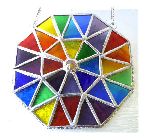 This is a stained glass suncatcher made using the Tiffany copper foil technique.