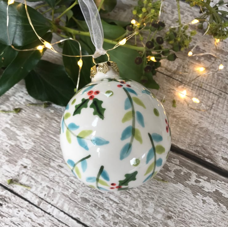This lovely hand-painted ceramic bauble features a hand painted design of a Robin perched on a twig covered in berries and surrounded by Holly & berries and leaves in shades of muted lime green and turquoise, giving a fresh folk art flavour.