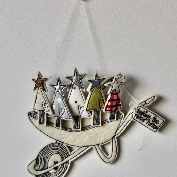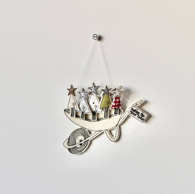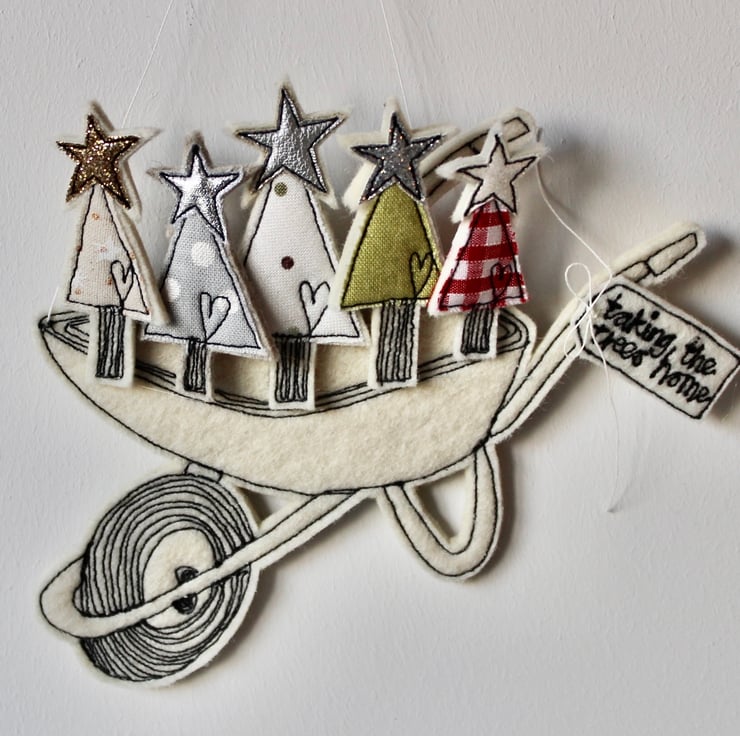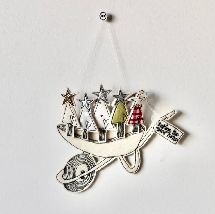'Taking the tree home' wheelbarrow is sewn using 100% wool felt, cotton cloth, glitter fabric and free hand machine embroidery; multiple layers of cloth are sewn together and cut out by hand using very sharp scissors. With a linen string to suspend.